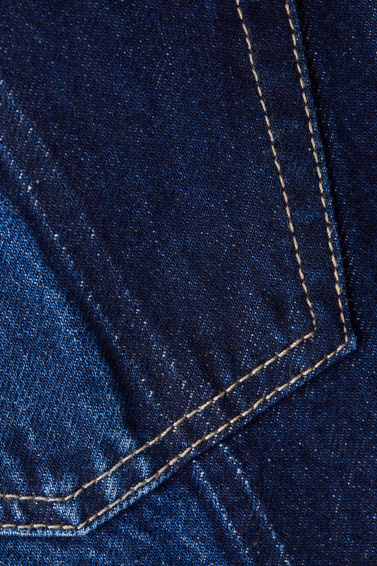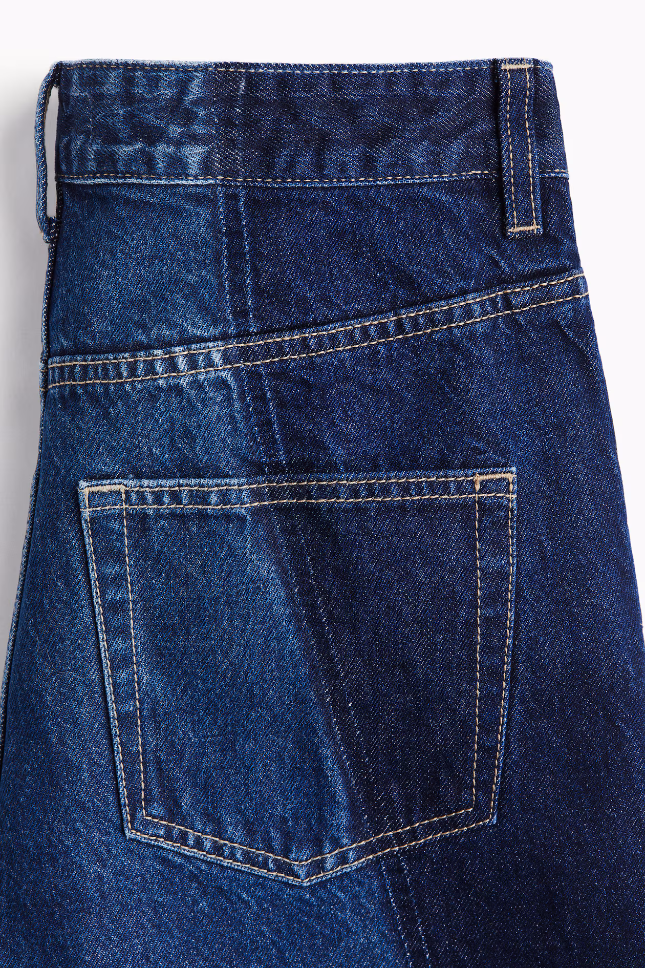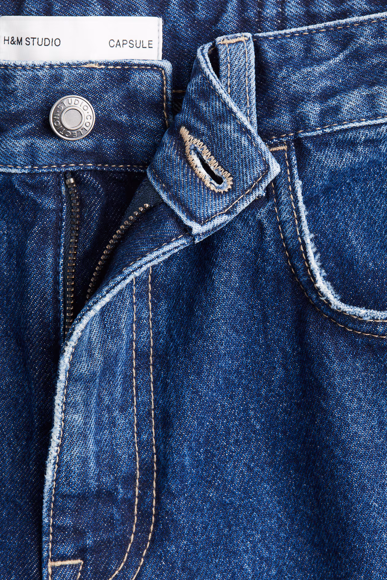 Jeans in rigid, two-tone cotton denim with faded stitch marks for a subtly distressed look. Regular fit from waist to hip and a looser, straight cut from thigh to hem. Regular waist, zip fly with button, and dropped gusset. Front pockets and back pockets. Straight, longer legs, designed to fall over foot with a stacking effect.