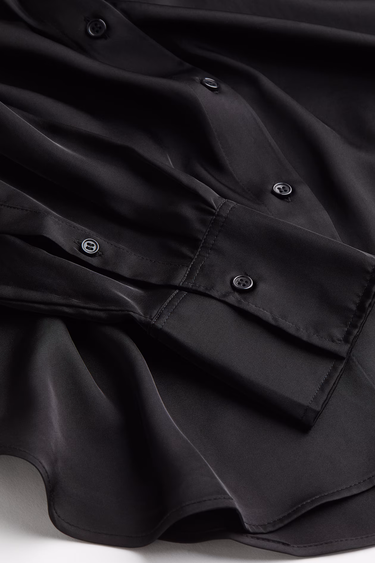 V-neck blouse in woven fabric with a sheen. Collar, buttons at front, and long sleeves with a sleeve placket and button at cuffs. Rounded hem.