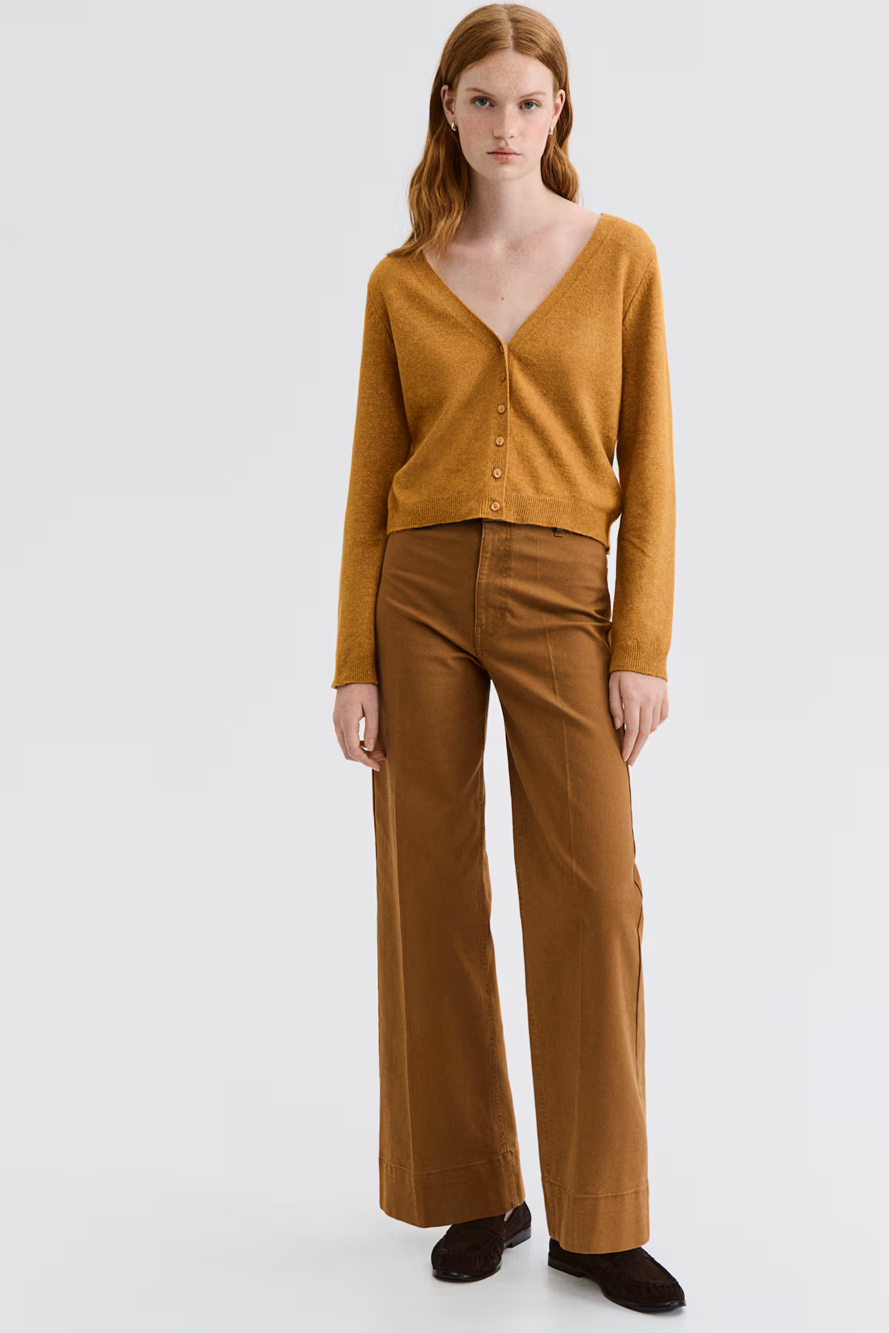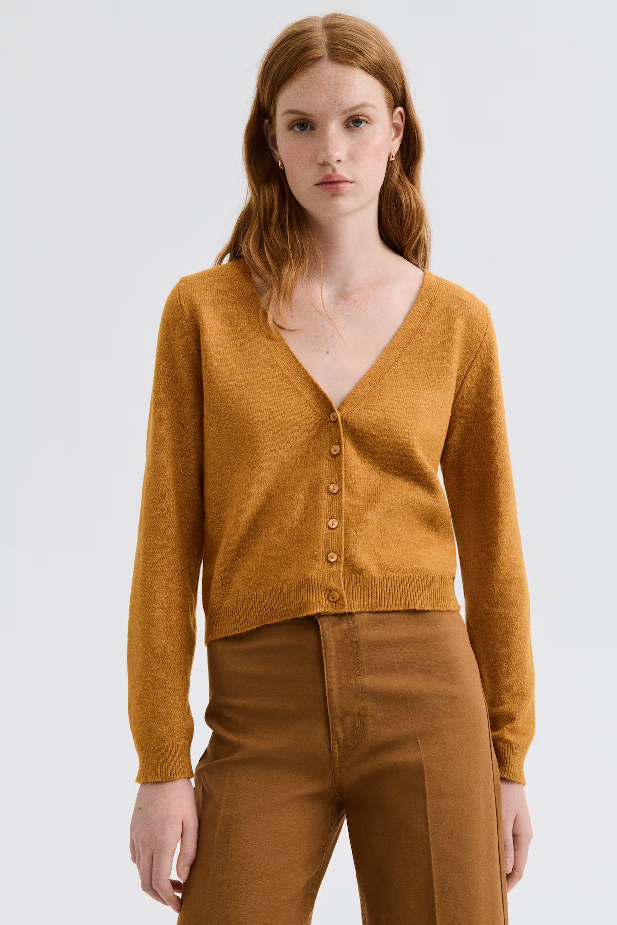 Short, fitted cardigan in a soft, fine knit. Low-cut V-neck, buttons at front, and gently dropped shoulders. Ribbing at cuffs and hem.