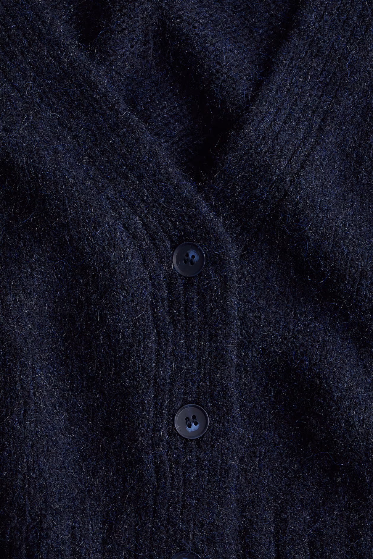 Short cardigan in a soft, fine knit. V-neck, buttons at front, and long sleeves. Ribbing at cuffs and hem.