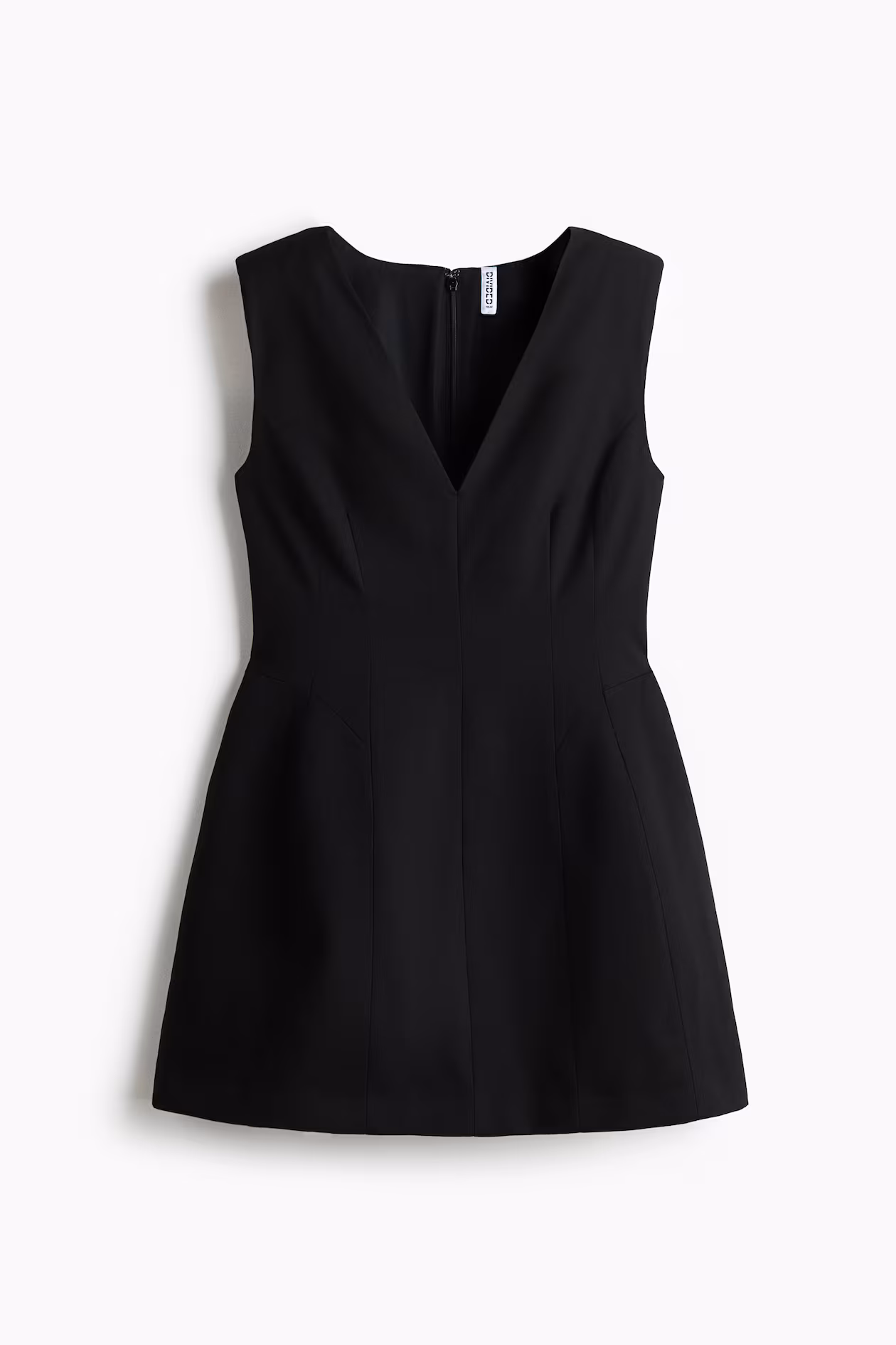 Short, sleeveless dress in twill with a fitted bodice and flared skirt. Low-cut V-neck at front, concealed zipper at back with hook-and-eye fastener, and shoulder pads. Lined.