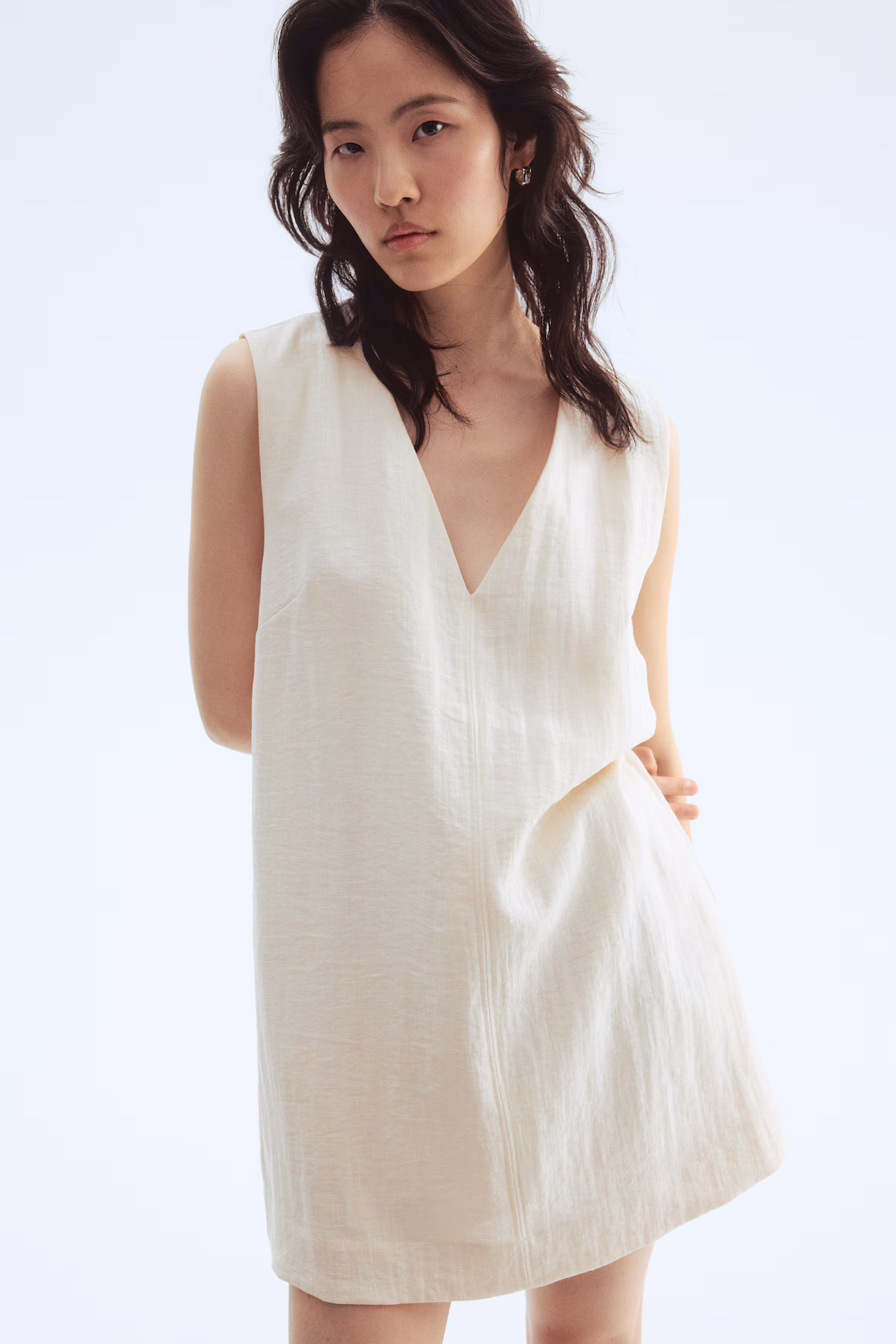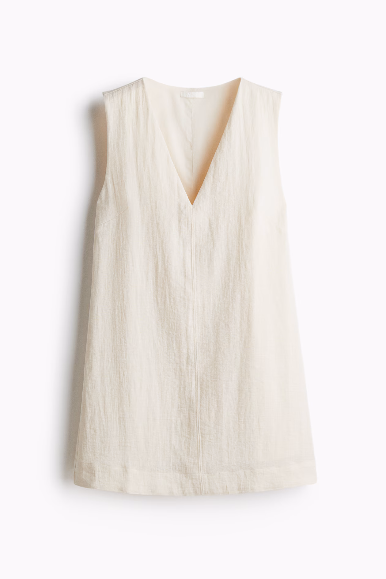 Short, sleeveless, A-line dress in woven fabric. V-neck and straight-cut hem. Lined.