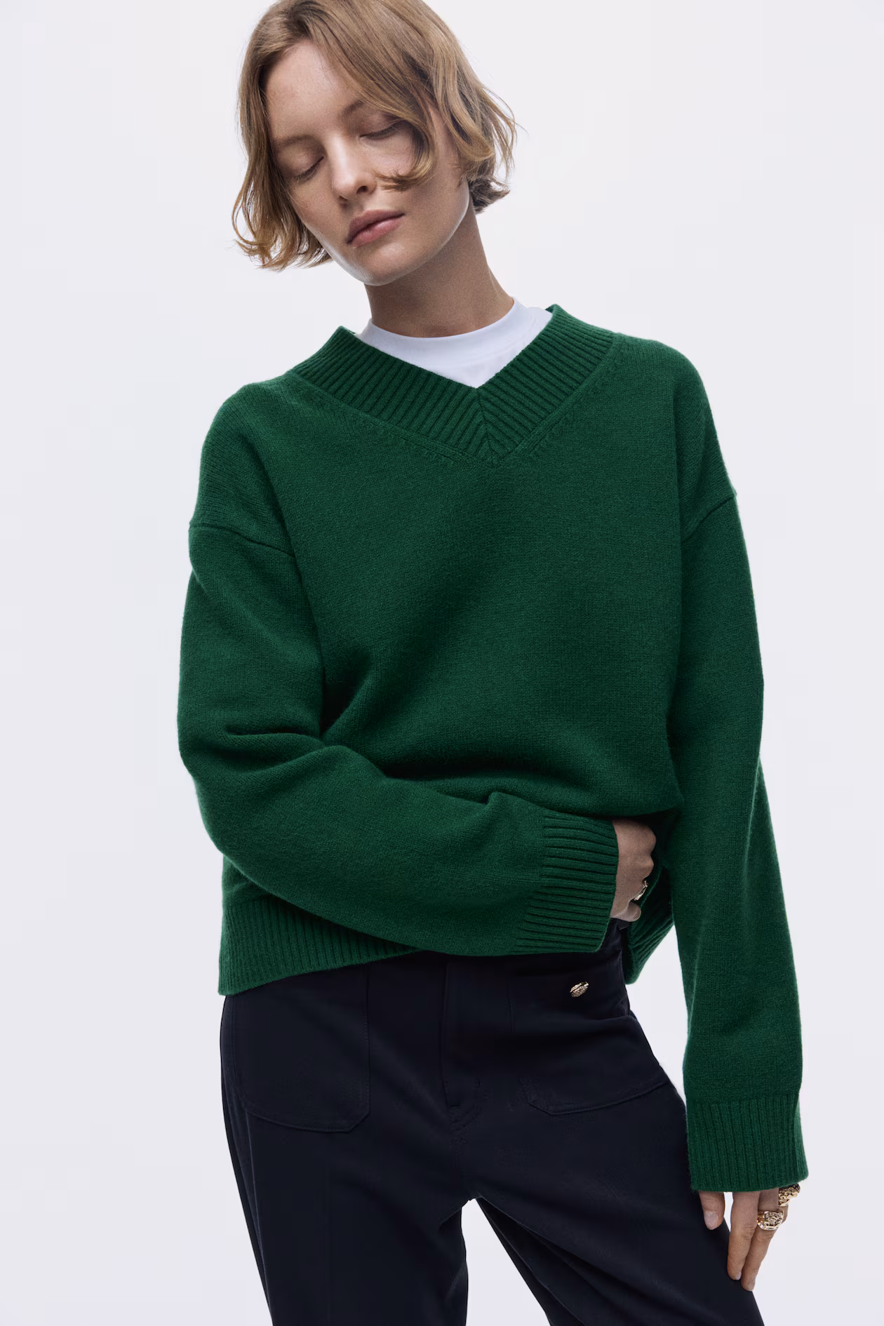 Oversized sweater in a soft knit. V-neck, dropped shoulders, and long sleeves. Ribbing at neck, cuffs, and hem.