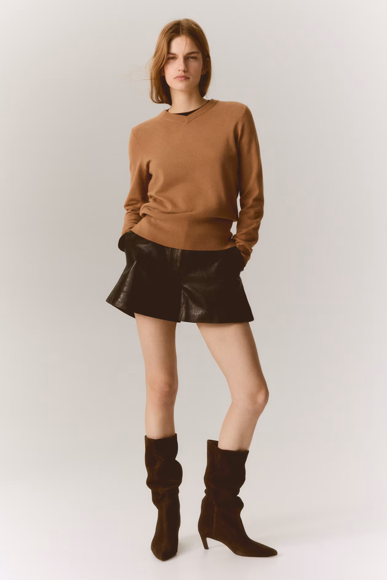 Fine-knit sweater with a ribbed V-neck and wide ribbing at cuffs and hem.