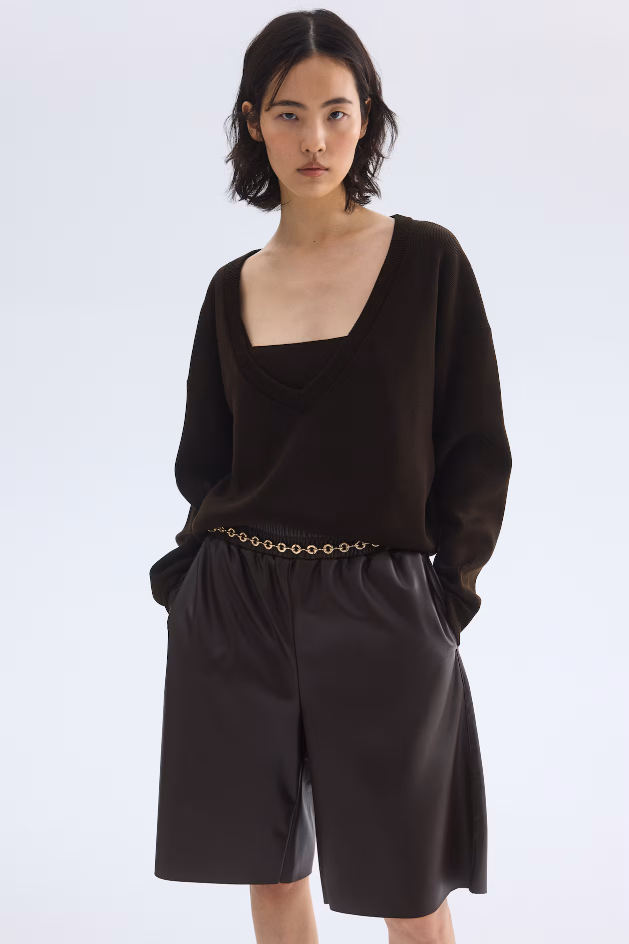 Oversized sweater in a soft knit. Low-cut V-neck at front with additional trim for a layered look, dropped shoulders, and ribbing at neck, cuffs, and hem.