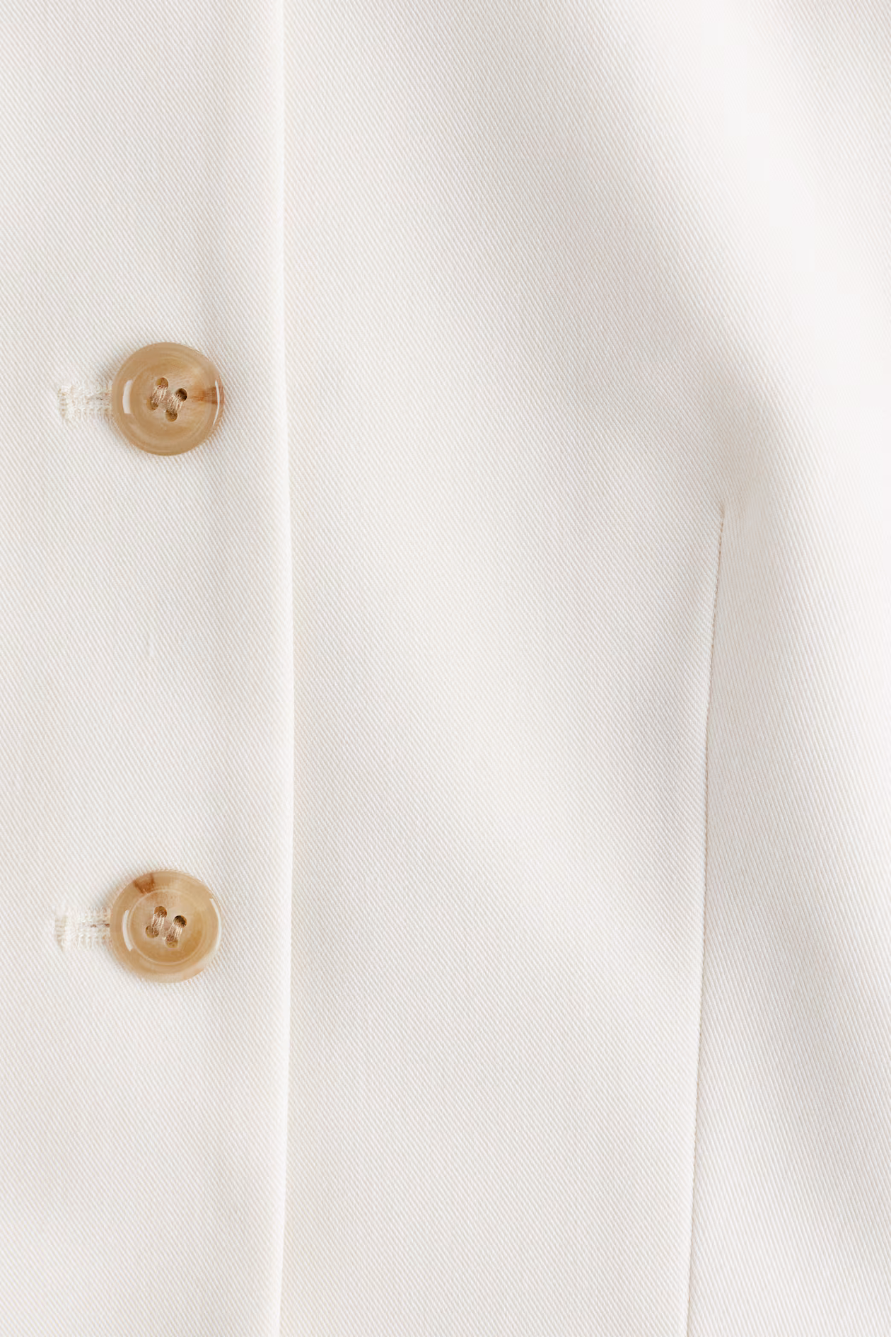 Single-breasted vest in cotton-blend twill. V-neck, buttons at front, and a flared peplum. Lined.
