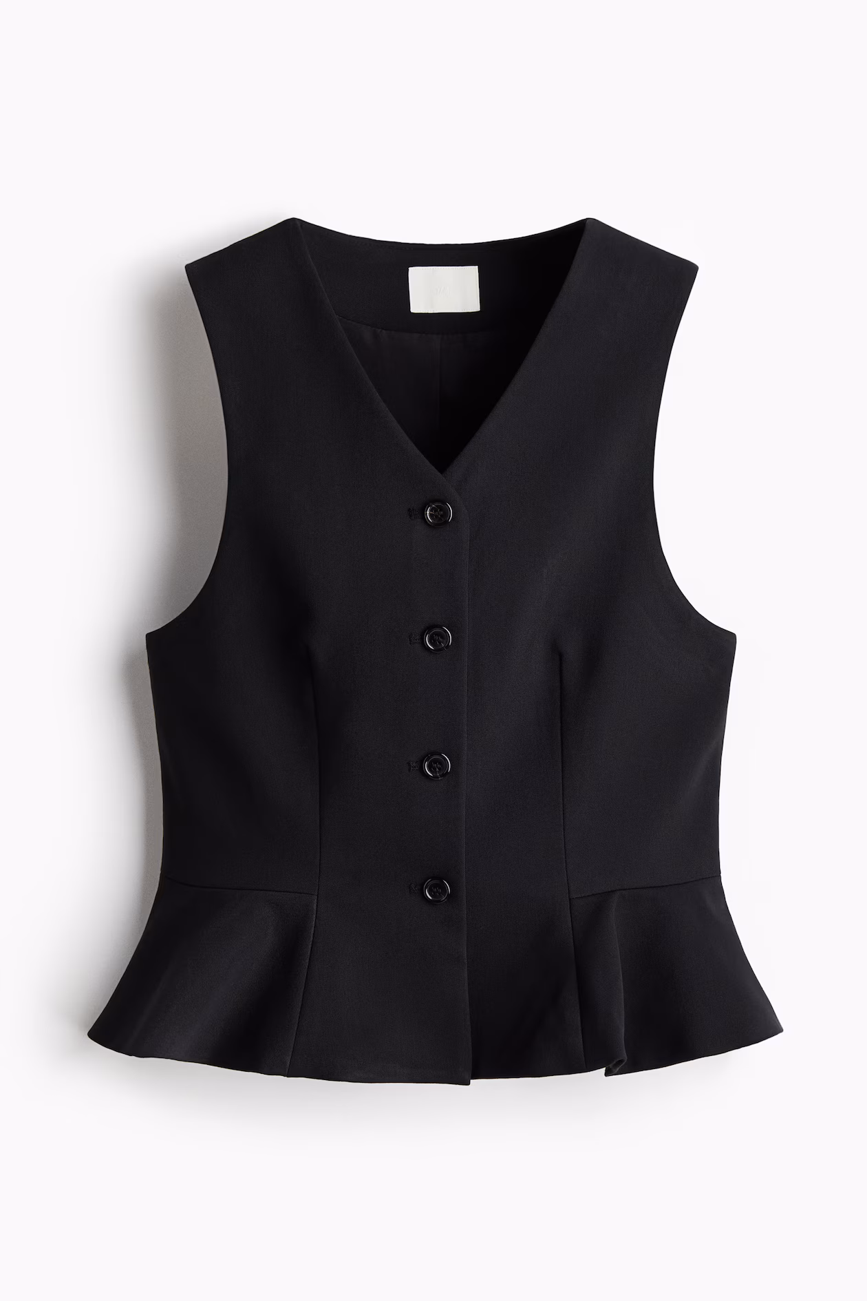 Single-breasted vest in cotton-blend twill. V-neck, buttons at front, and a flared peplum. Lined.