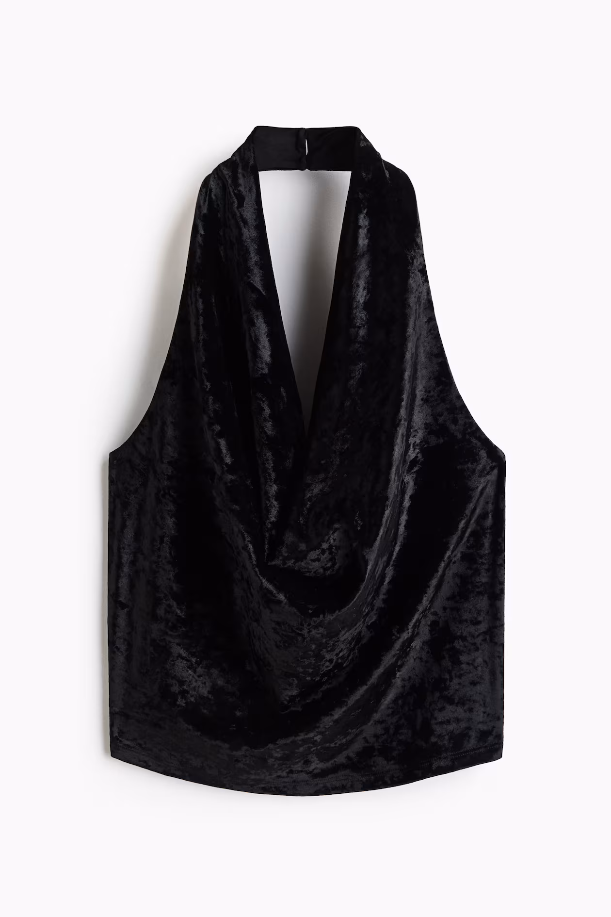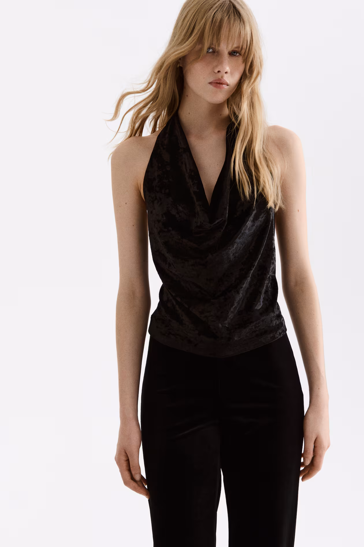 Fitted, cowl-neck top in soft velour. Wide halterneck strap with buttons at back of neck.