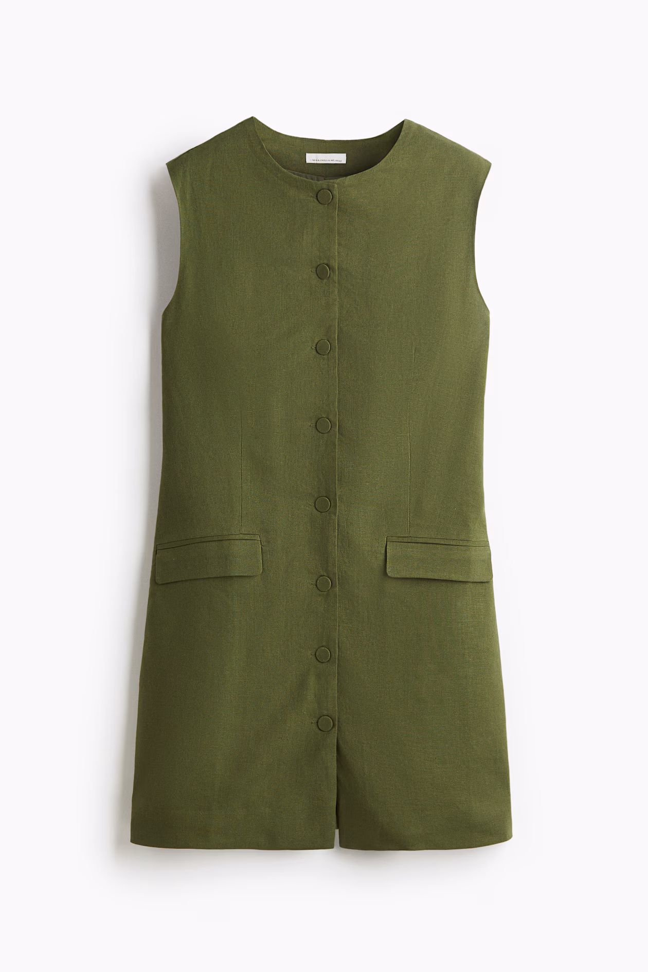 Short, fitted, sleeveless dress in woven fabric with shaping darts at front and back. Round neckline, buttons at front, and mock front pockets with flap. Lined.
