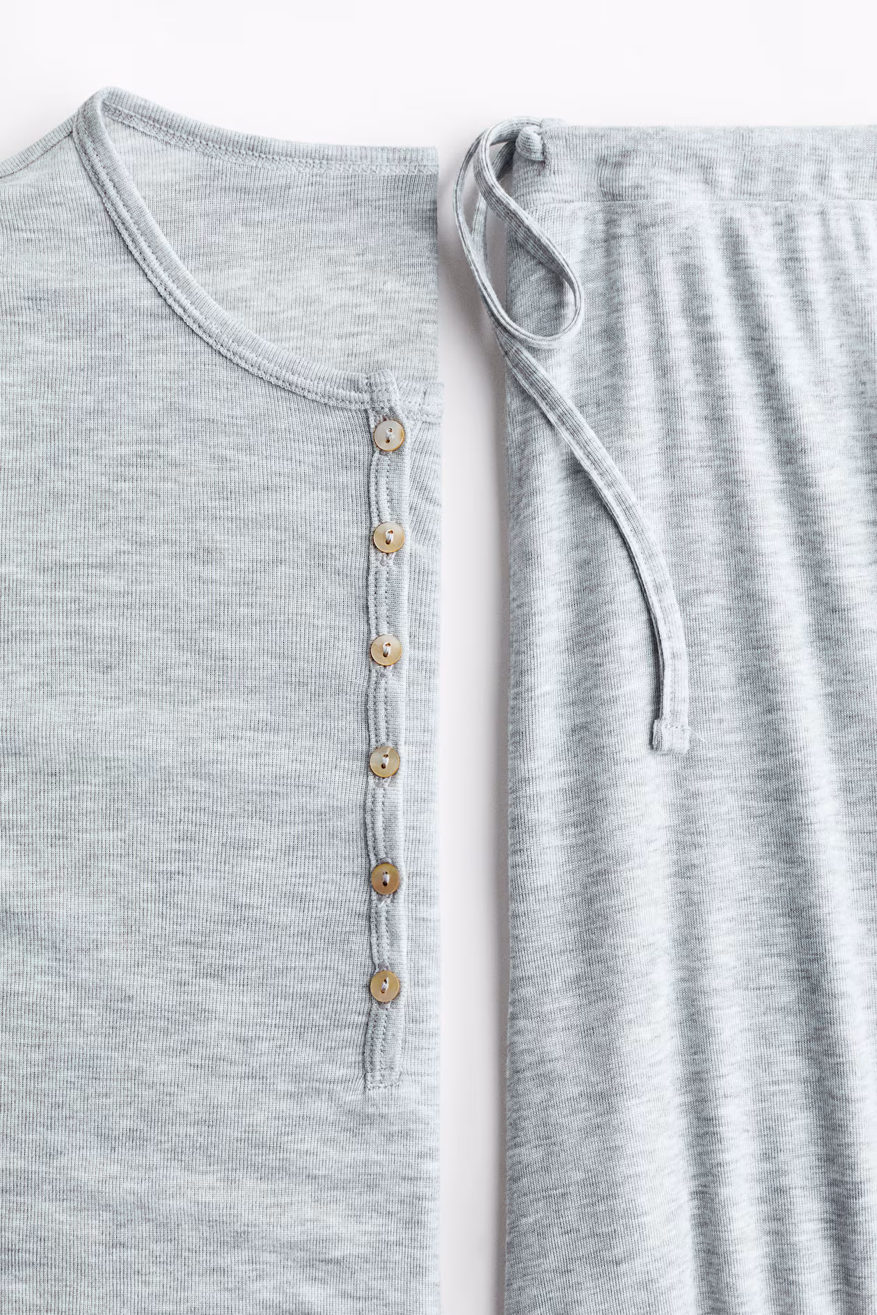 Pajamas in sheer, viscose-blend jersey with a top and pants. Fitted top with a round neckline, seashell-look buttons at top, and long sleeves. Pants with an elasticized, drawstring waistband and straight legs.