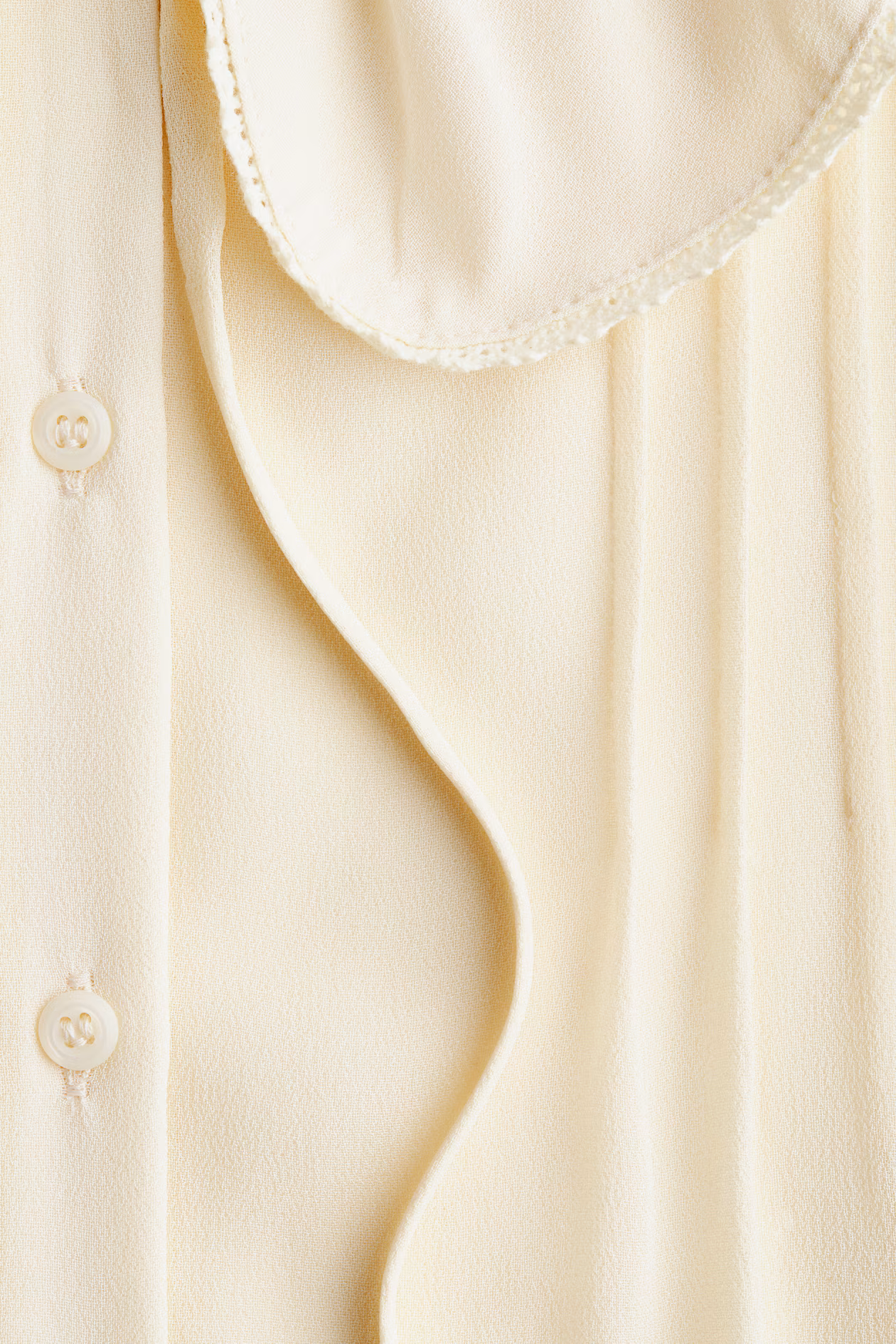 Blouse in sheer woven viscose with pintucks at front. Peter Pan collar with narrow lace trim, narrow ties at top, and buttons at front. Long puff sleeves and cuffs with button and narrow lace trim.