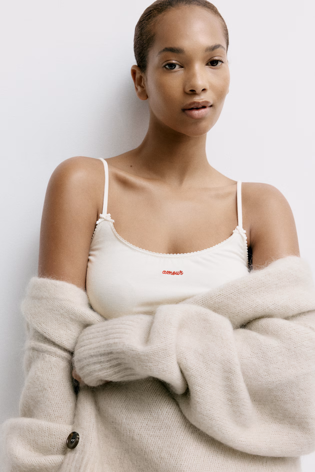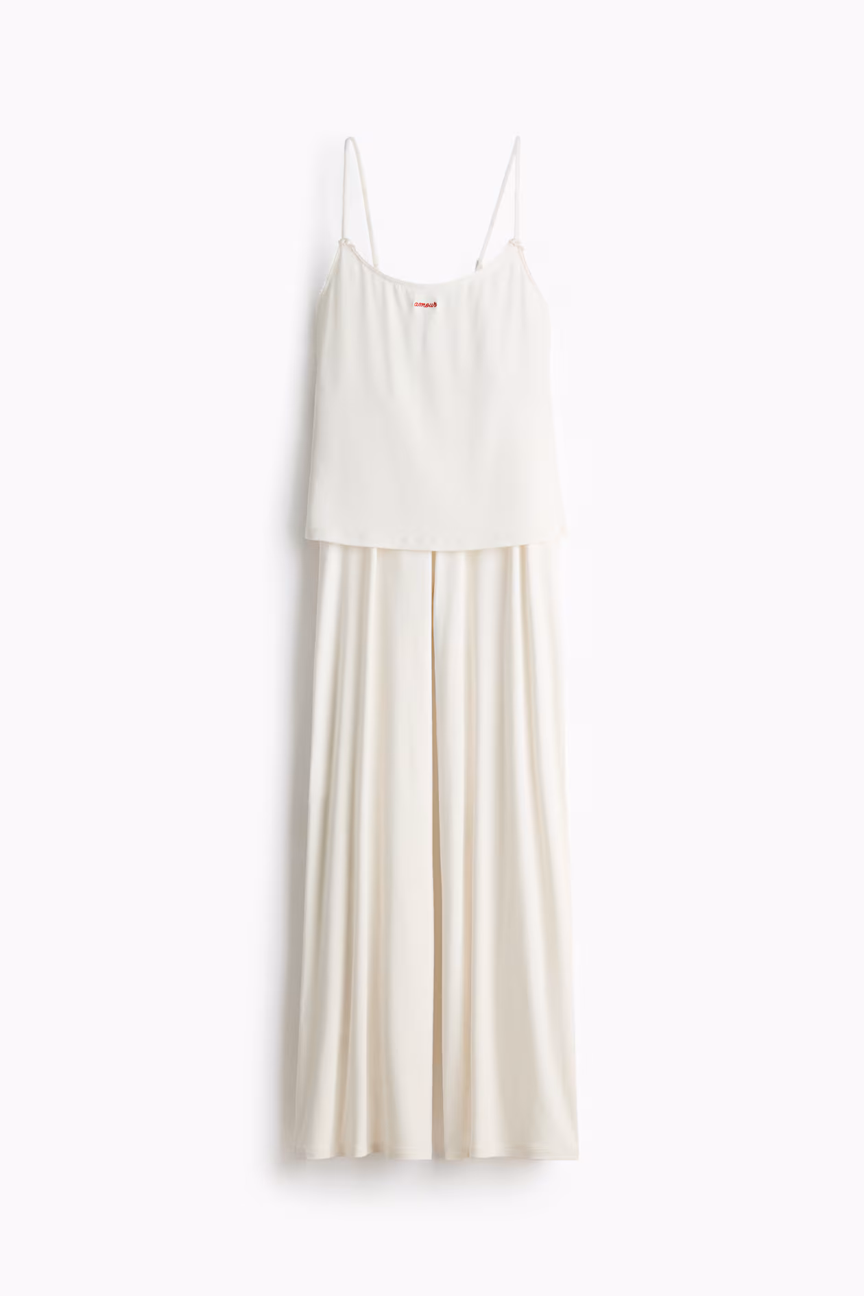 Pajamas in soft viscose jersey with a camisole top and pants. Top with narrow, adjustable shoulder straps with small satin bows at front, scoop neck, delicate picot trim at upper edge, and an embroidered detail at front. Pants with an elasticized, picot-trimmed waistband with a small satin bow at front, and wide legs.