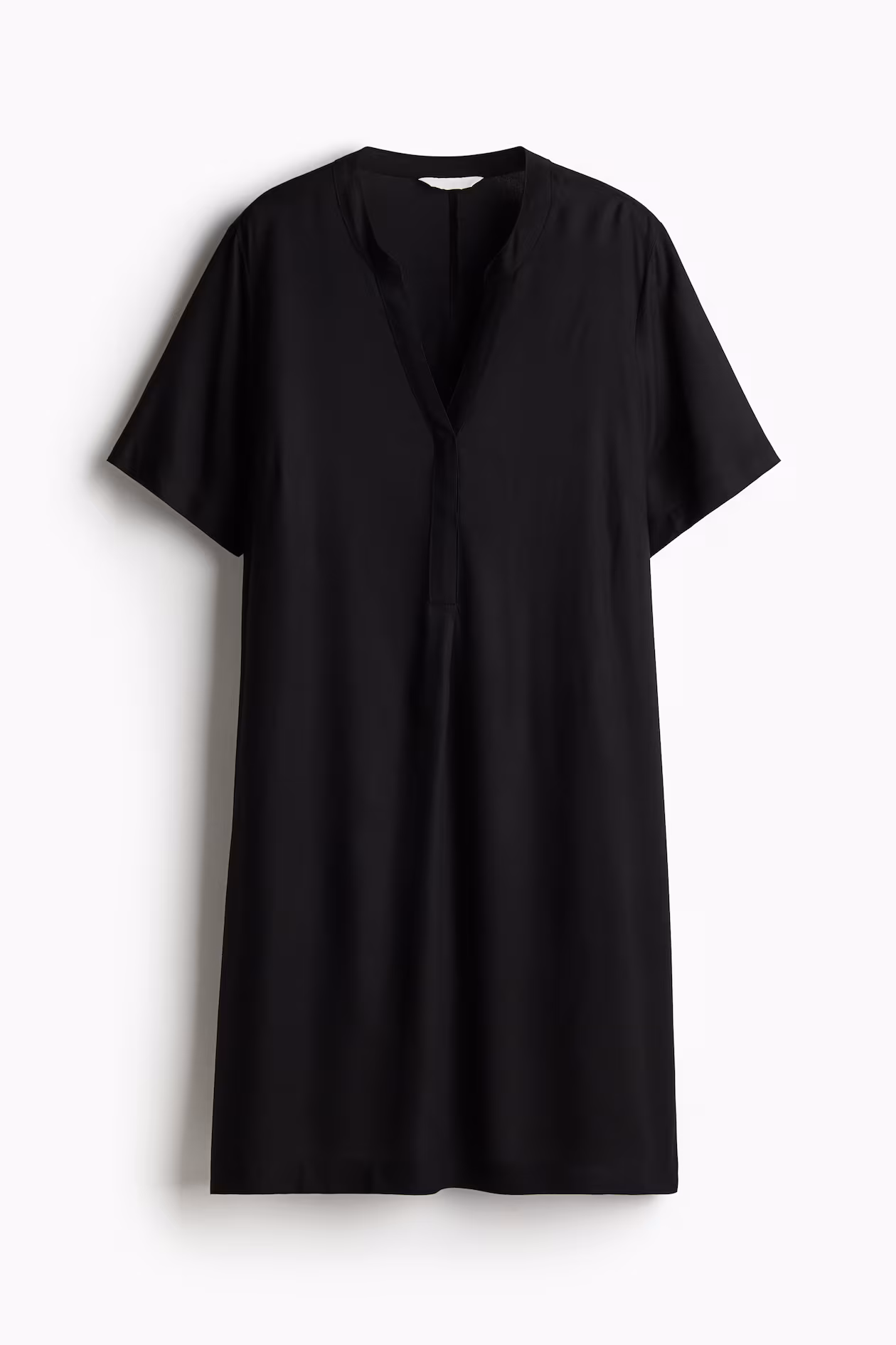 Loose-fit, knee-length tunic dress in airy, woven viscose fabric. Band collar, V-shaped opening at front, gently dropped shoulders, and short sleeves. Straight-cut hem with slit at sides and slightly longer hem at back. Unlined.