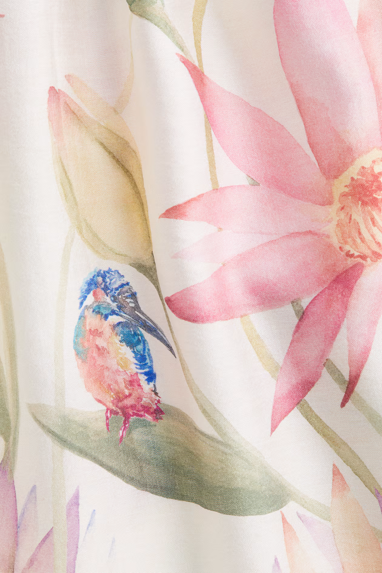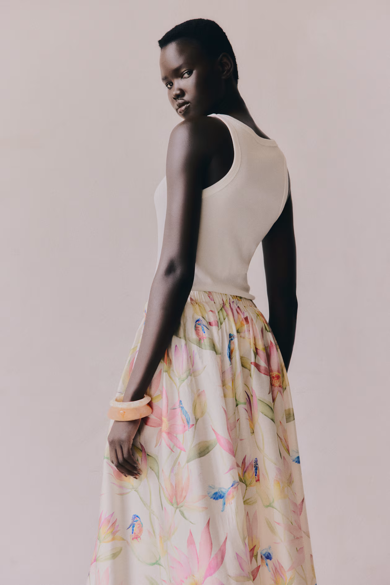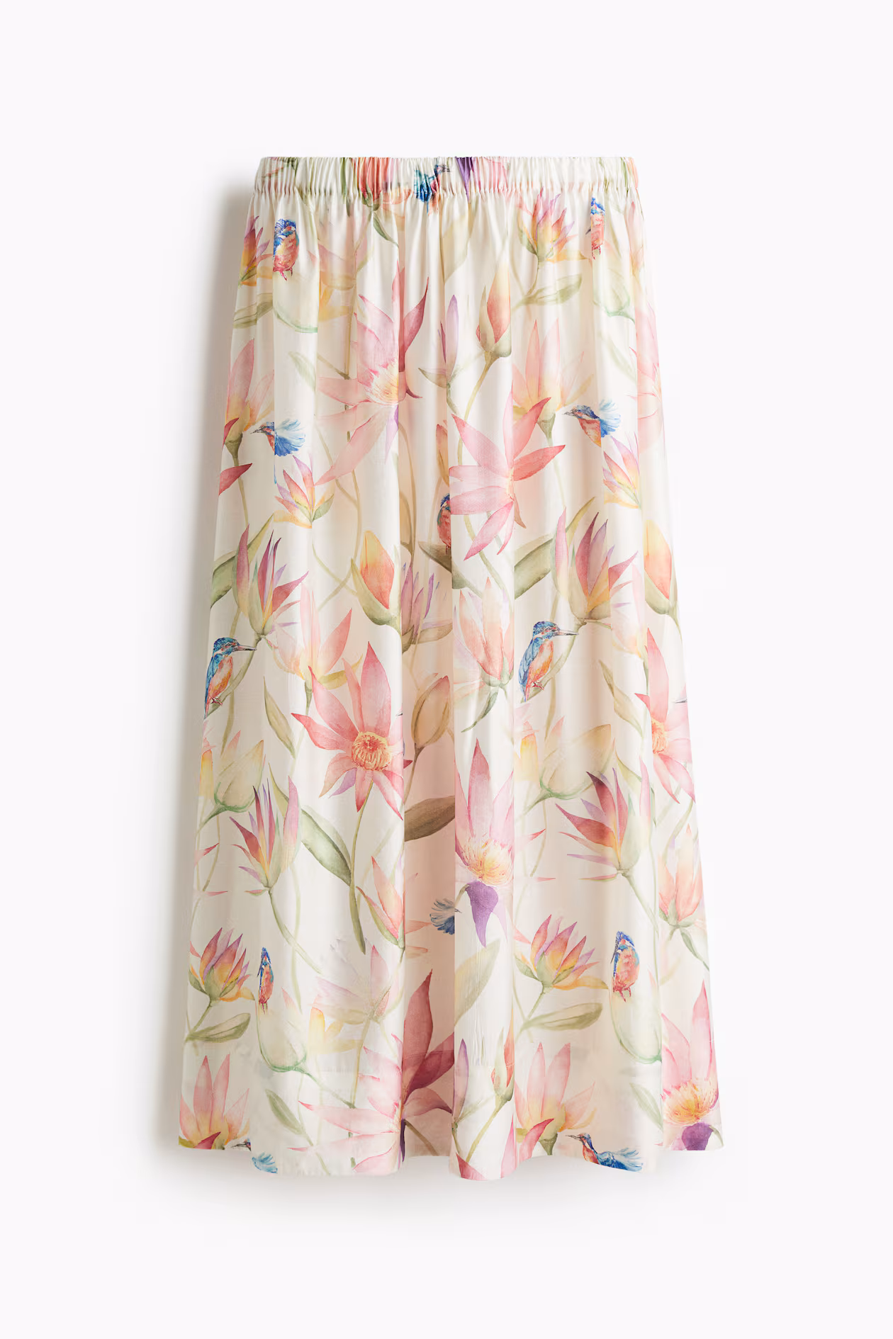 Loose-fit, calf-length skirt in woven fabric with a slight sheen. High waist, elasticized waistband with gathers, and a voluminous silhouette. Unlined.