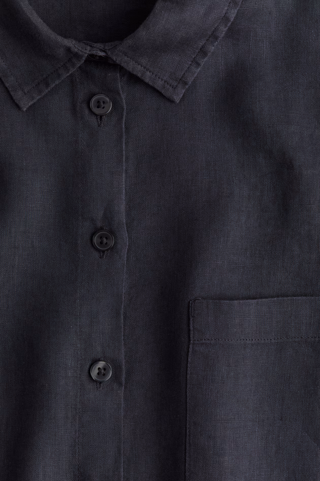 Long nightshirt in washed linen. Collar, buttons full length of front, and yoke at back with box pleat. Open chest pocket, dropped shoulders, and long sleeves. Rounded hem.
