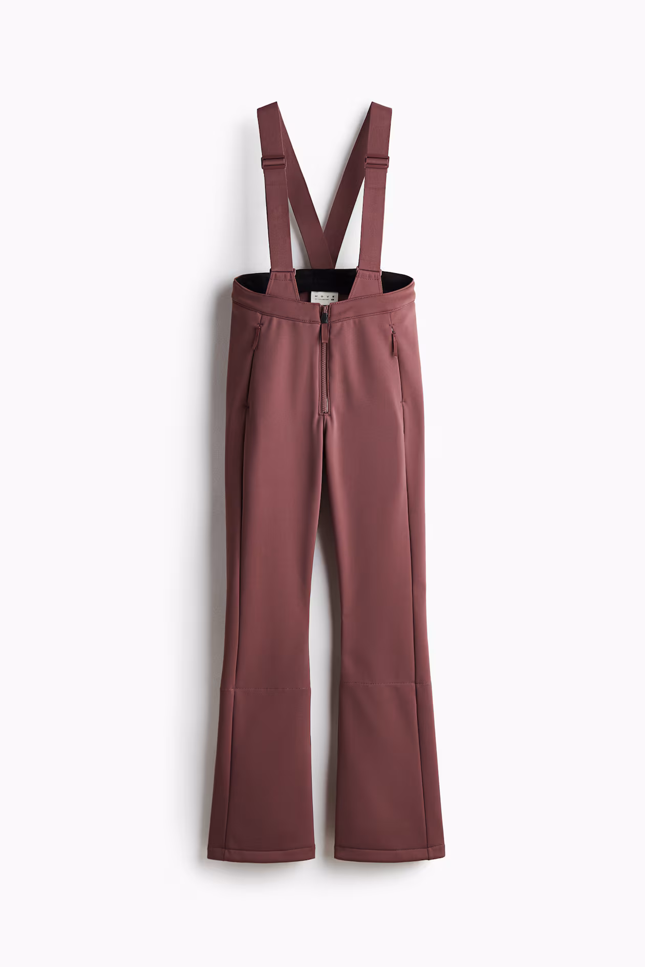 Slim-fit ski pants in breathable, windproof, and water-repellent functional fabric designed for protection from snow and wind. Adjustable, elasticized suspenders, high waist, and waterproof zipper at front. Side pockets with zipper for safer storage of valuables. Gently flared hems with a zipper and integrated snow gaiters with a snug fit around ski boots. Soft, brushed jersey inside for warmth.