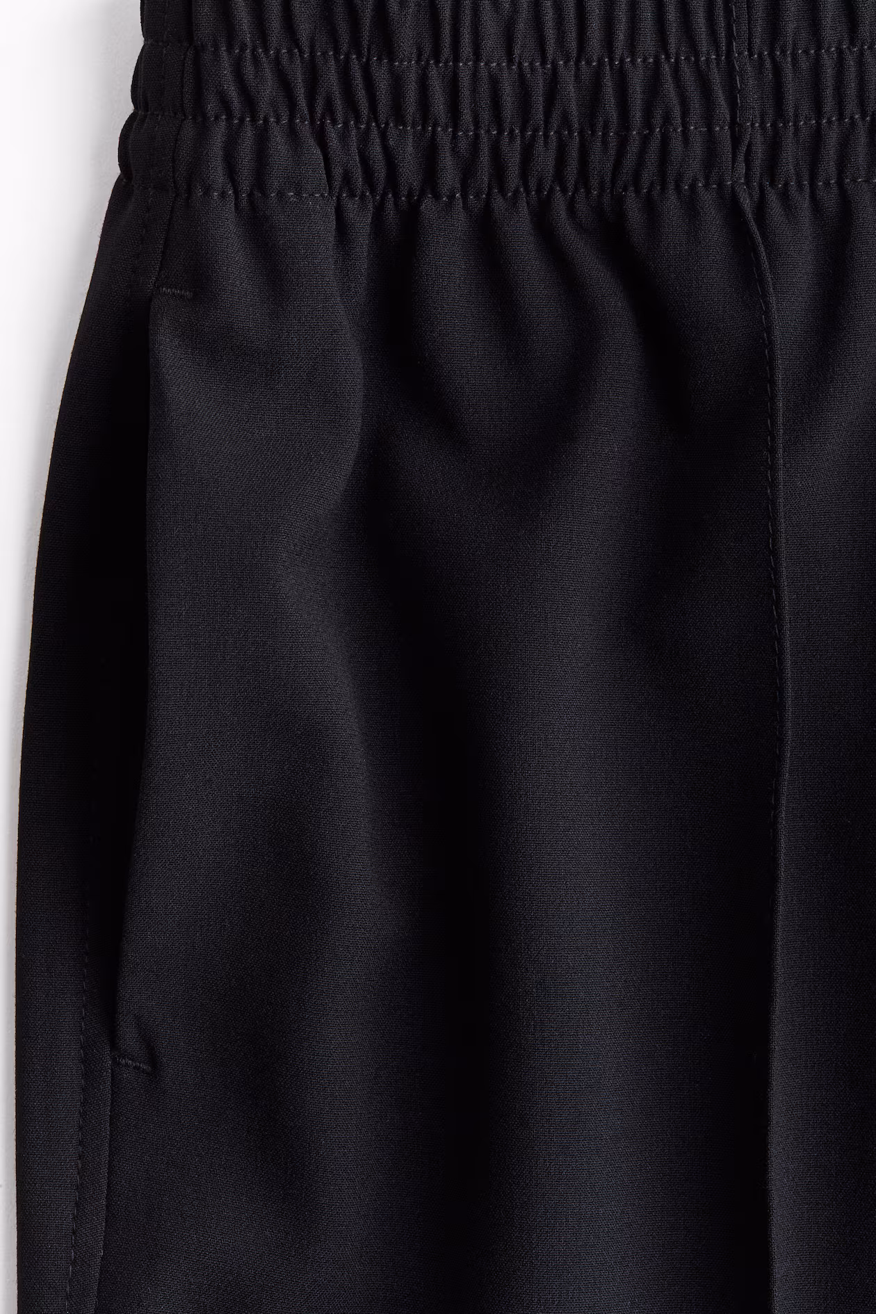 Pants in twill. High waist, elasticized waistband, mock fly, and discreet side pockets. Stitched creases at front and pressed creases at back. Wide legs.