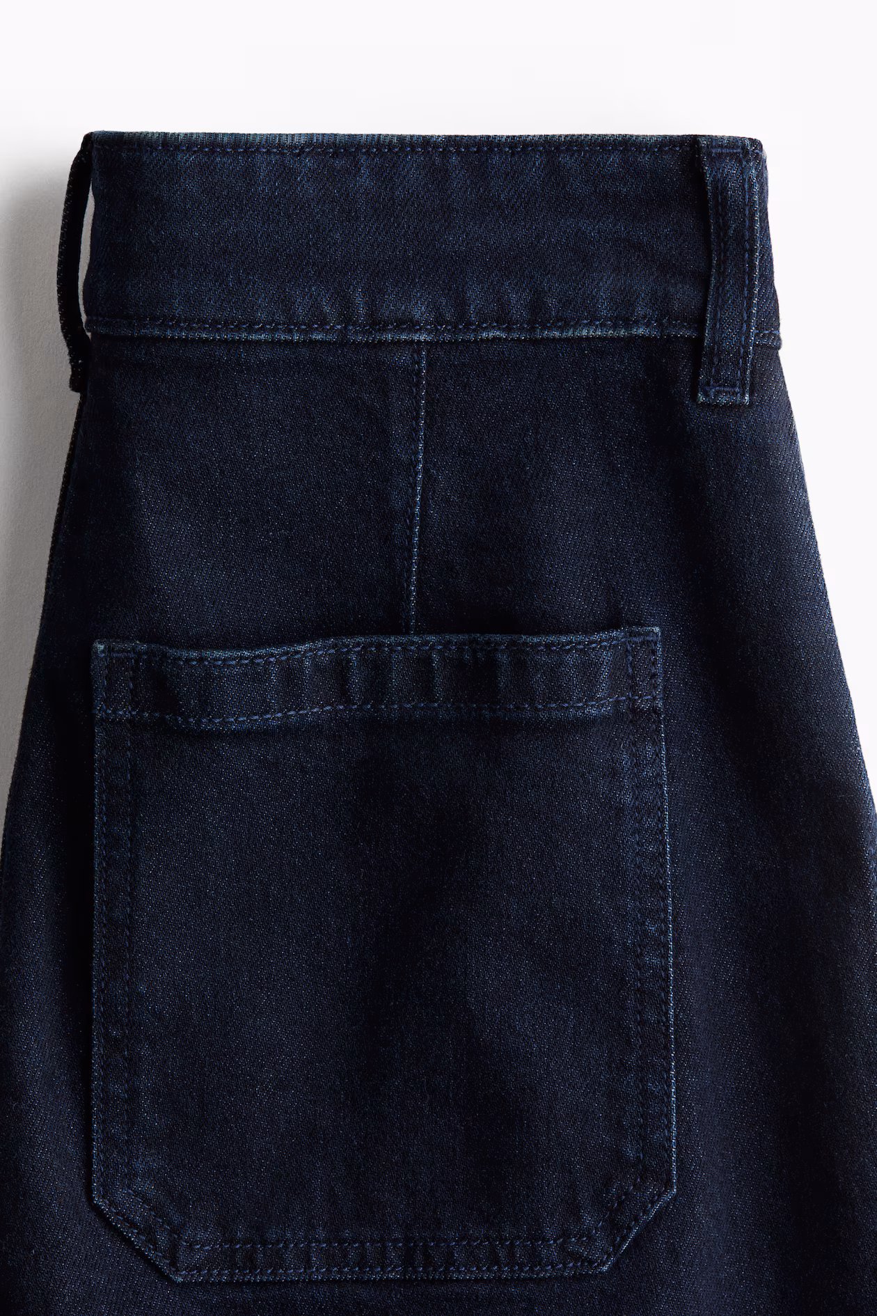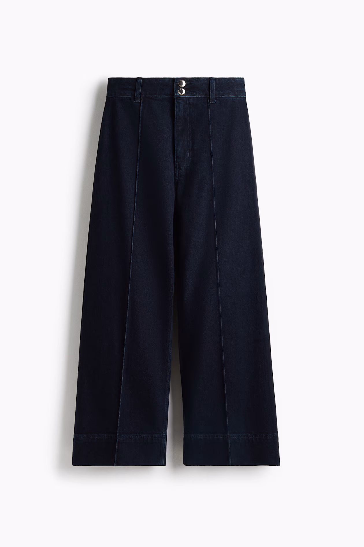 Ankle-length jeans in cotton denim with gentle stretch for good comfort. Regular fit from waist to hip and wide cut from thigh to hem. High waist, zip fly with buttons, patch back pockets, and stitched creases at front. Wide legs. Inspired by the 70s, designed for today.