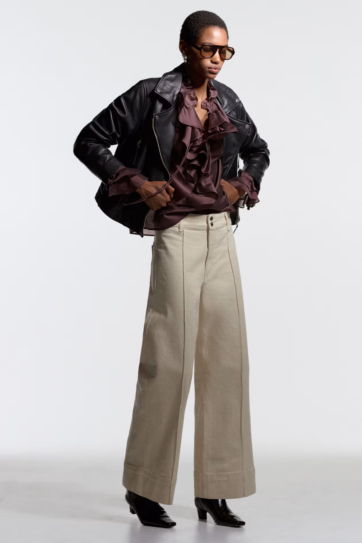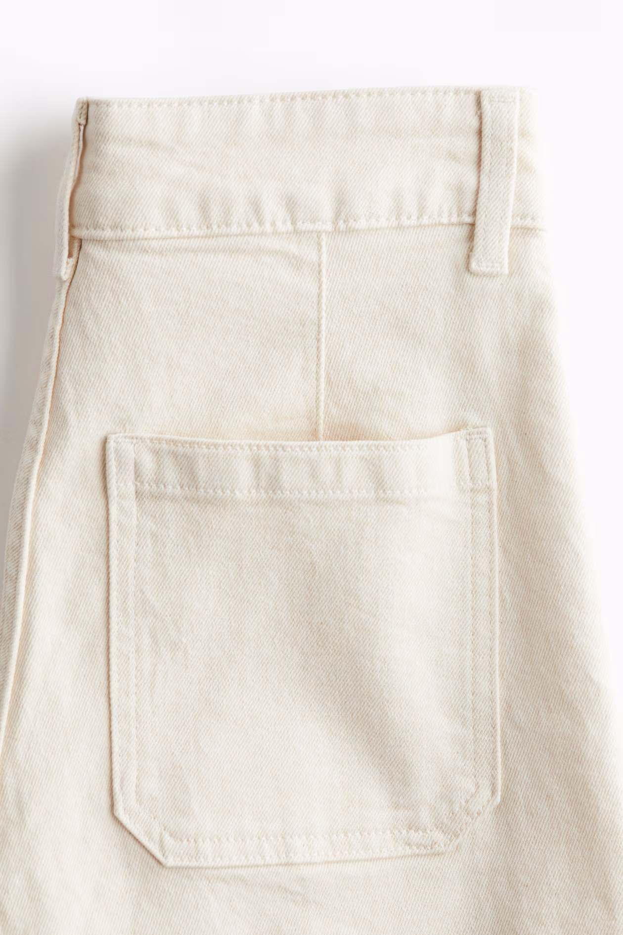 Ankle-length jeans in cotton denim with gentle stretch for good comfort. Regular fit from waist to hip and wide cut from thigh to hem. High waist, zip fly with buttons, patch back pockets, and stitched creases at front. Wide legs. Inspired by the 70s, designed for today.