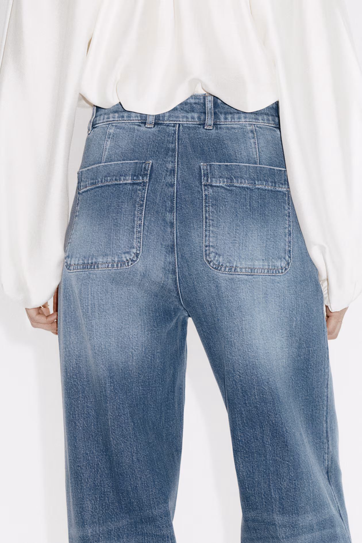 Jeans in cotton denim with gentle stretch for good comfort. Regular fit from waist to hip and wide cut from thigh to hem. High waist, zip fly with a fluted-finish metal button, and creases at front and back. Patch front pockets and patch back pockets. Wide, regular-length legs, designed to fall at top of foot with little or no stacking. The wide-leg jean is a wardrobe essential.