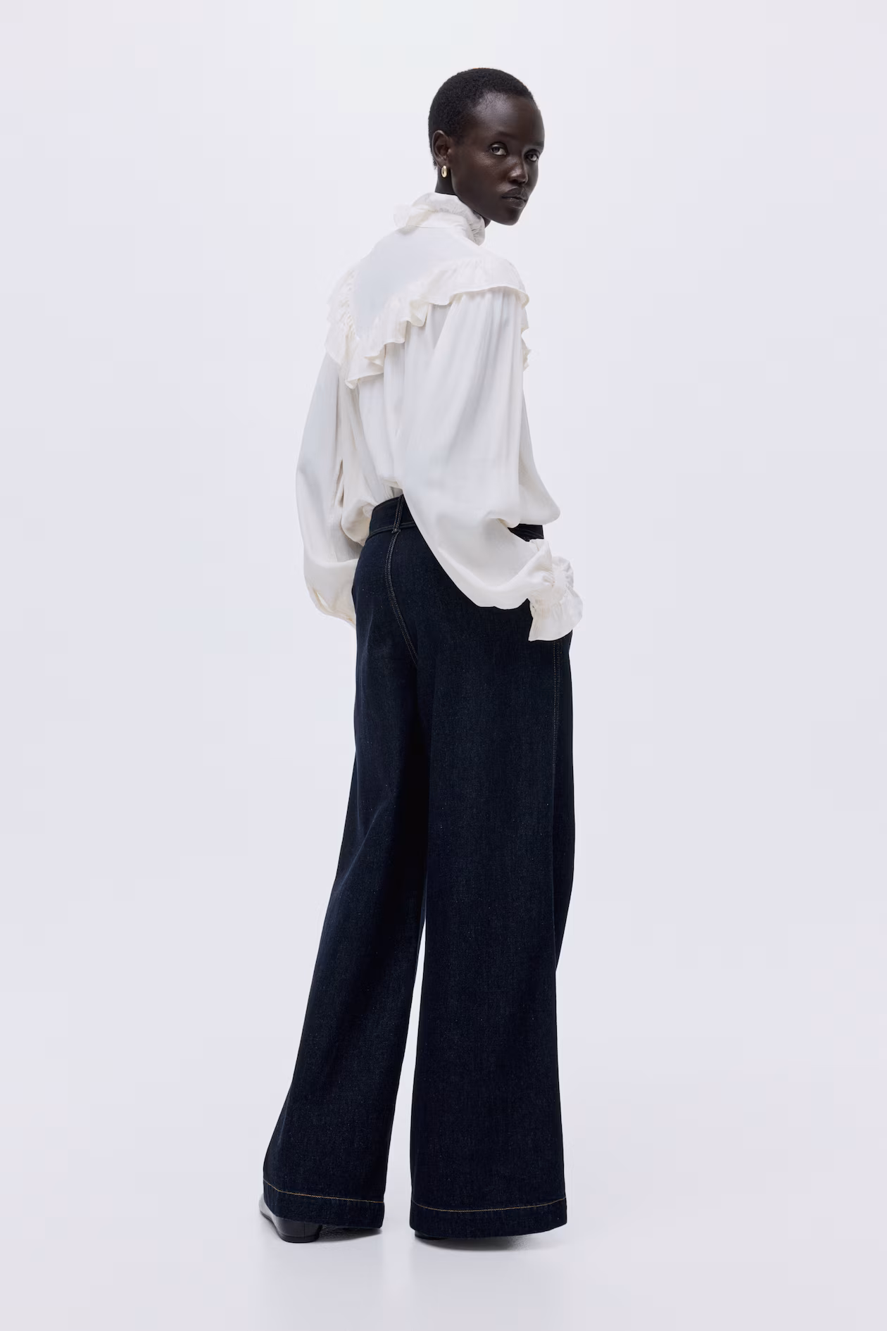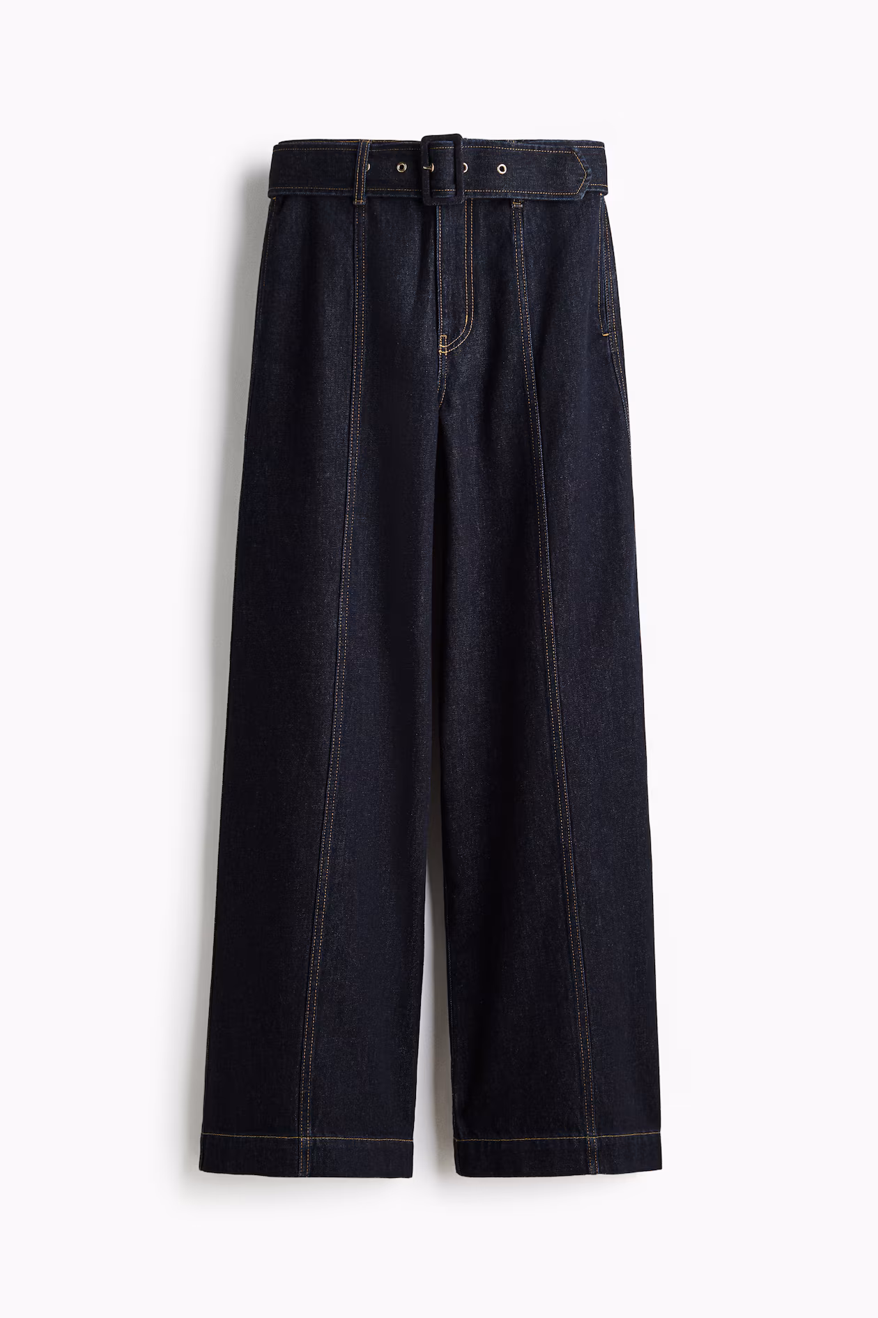 Jeans in rigid cotton denim that feels firm at first, softening and relaxing with wear. Regular fit from waist to hip and wide cut from thigh to hem. High waist with belt, zip fly with hook-and-eye fastener, discreet side pockets, and visible, vertical seams at front. Wide, regular-length legs, designed to fall at top of foot with little or no stacking. Effortlessly flattering no matter how they're styled.