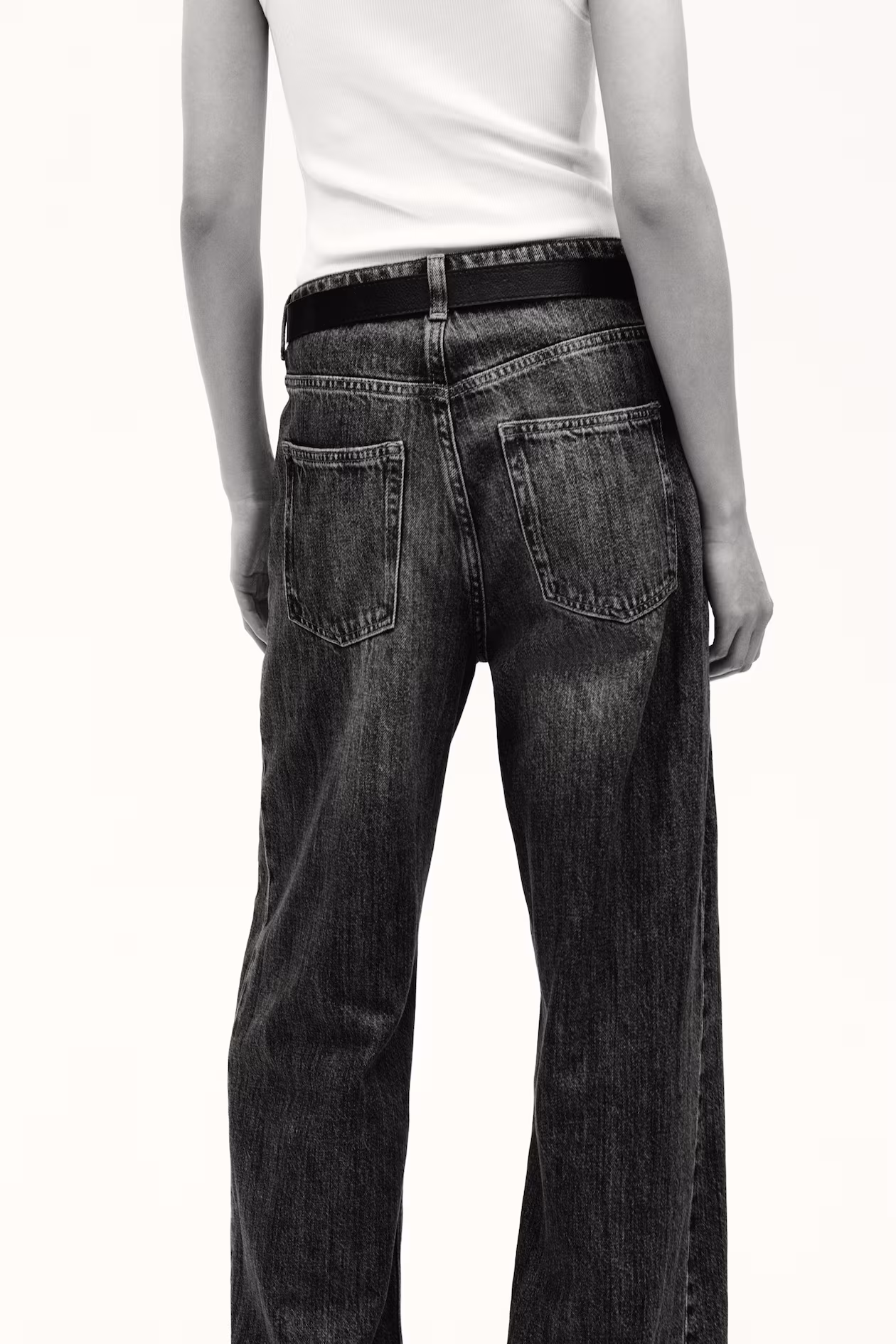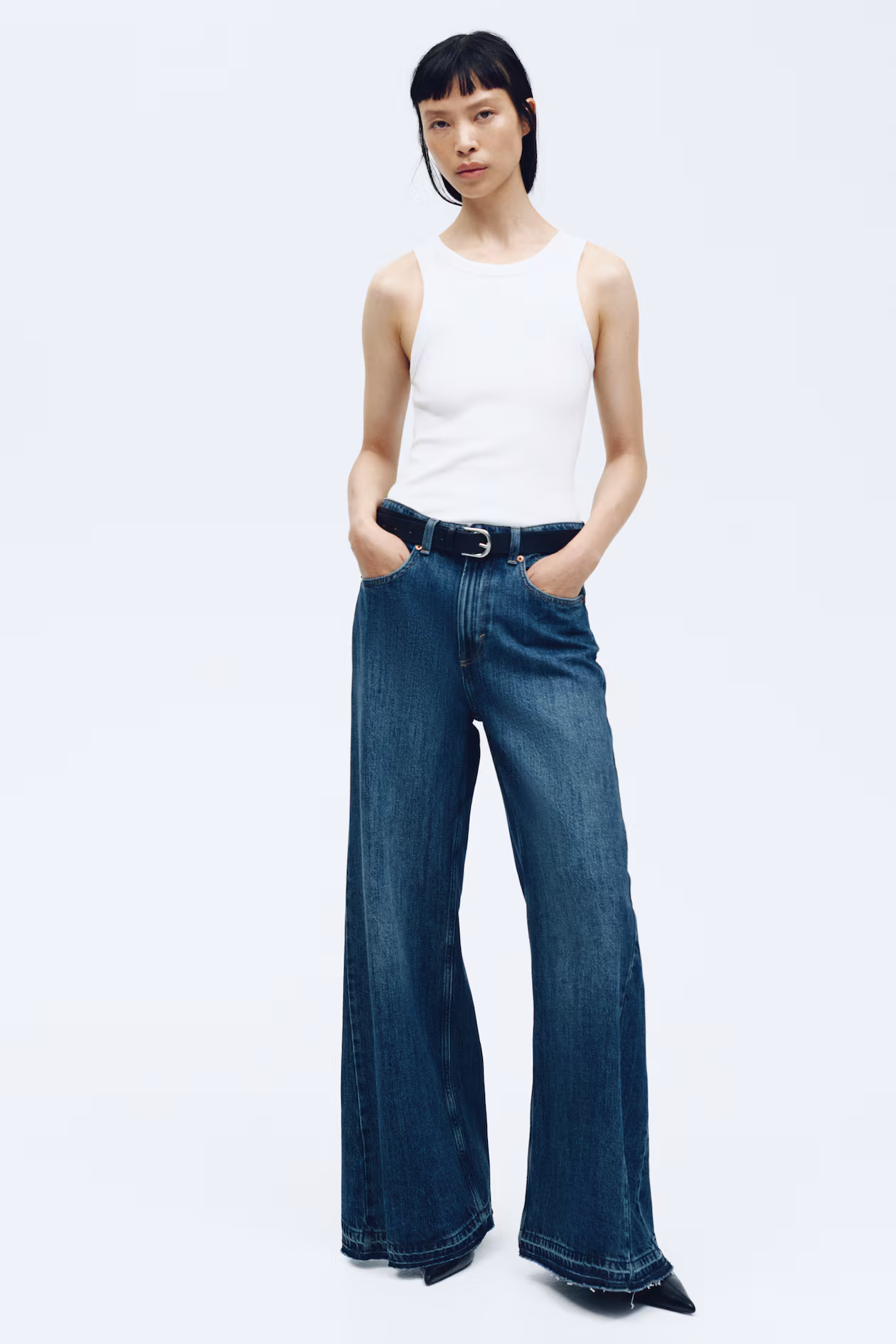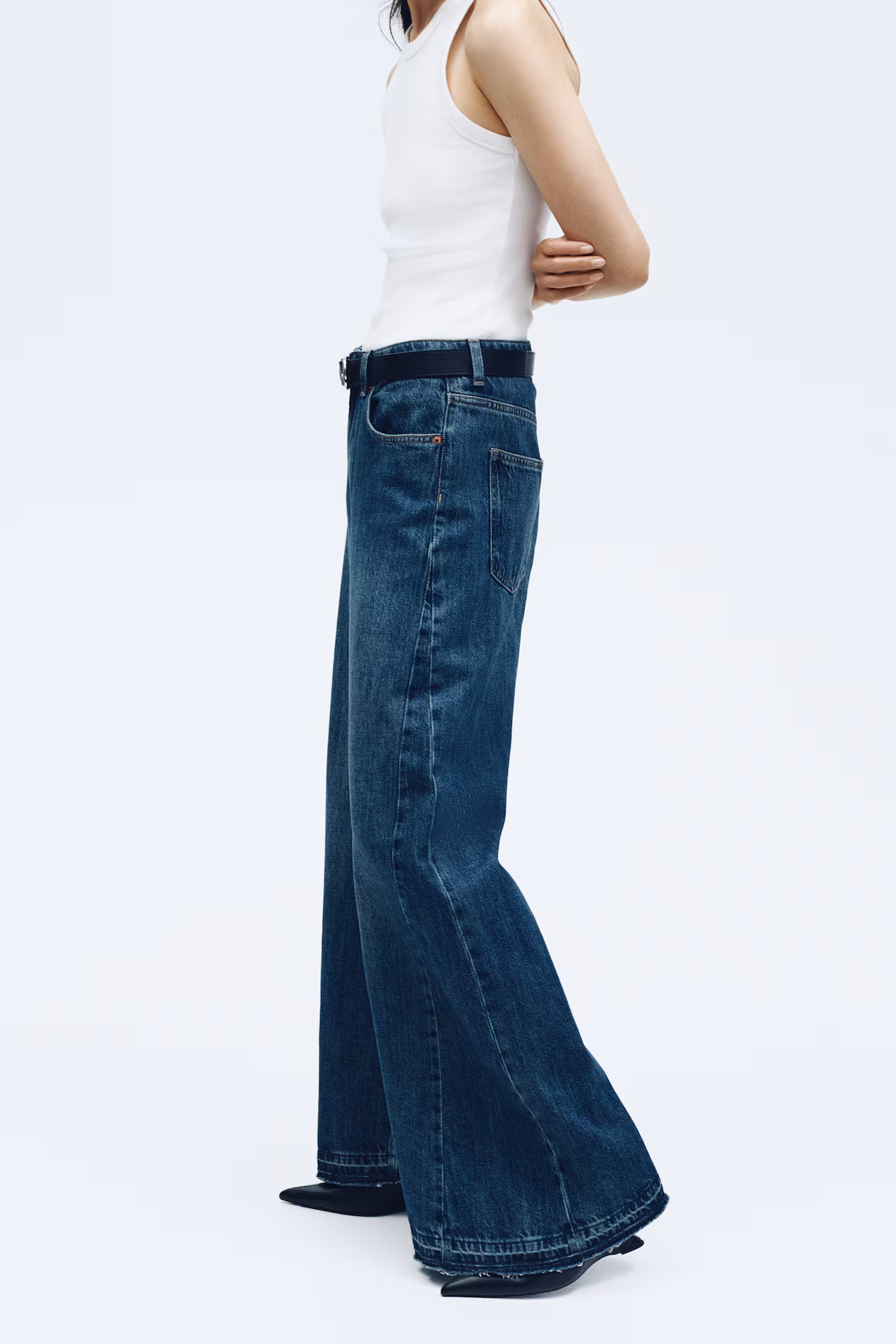 5-pocket jeans in rigid cotton denim that feels firm at first, softening and relaxing with wear. Regular fit from waist to hip and wide cut from thigh to hem. High waist and zip fly with button. Wide, regular-length legs, designed to fall at top of foot with little or no stacking. A denim statement that goes the distance.