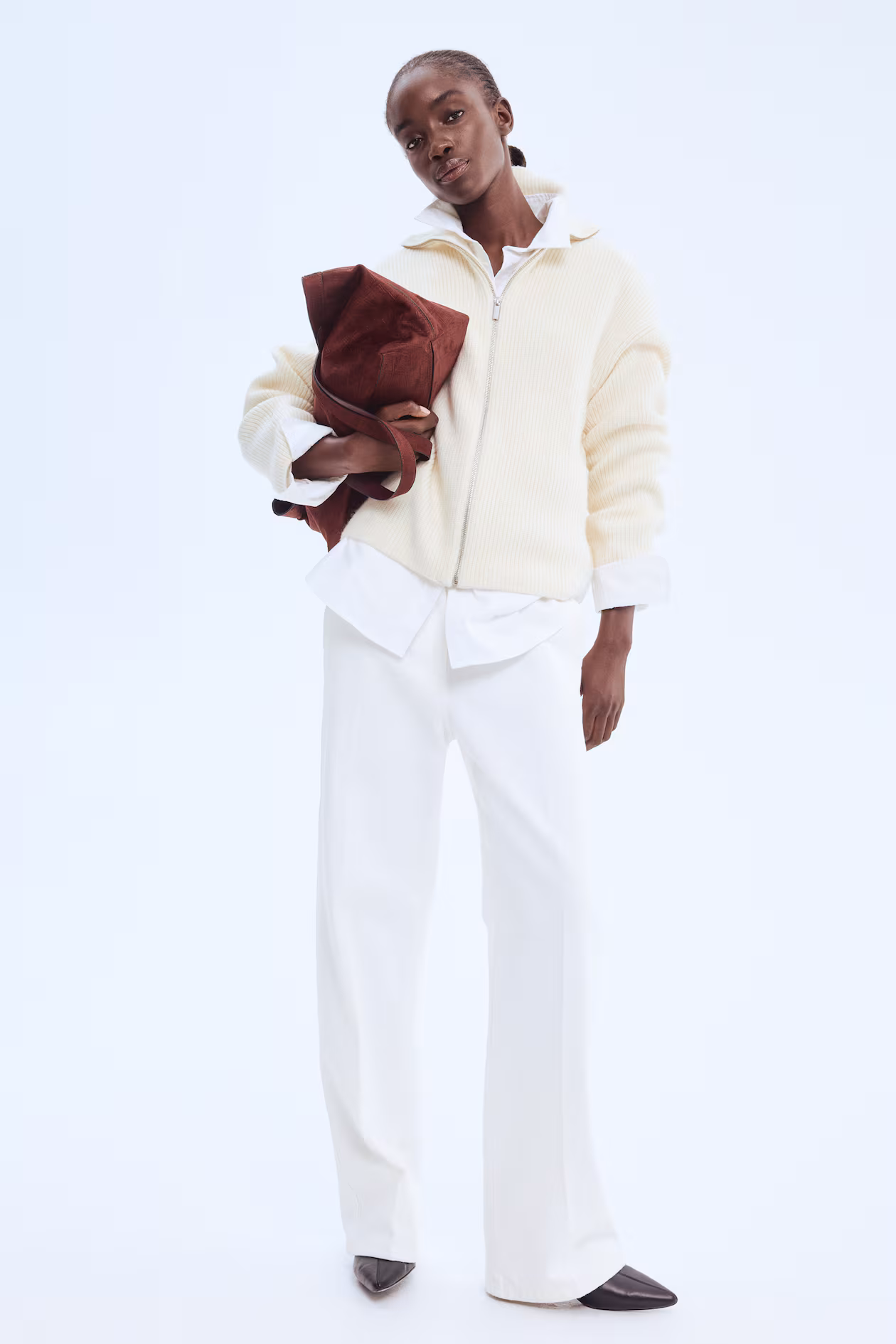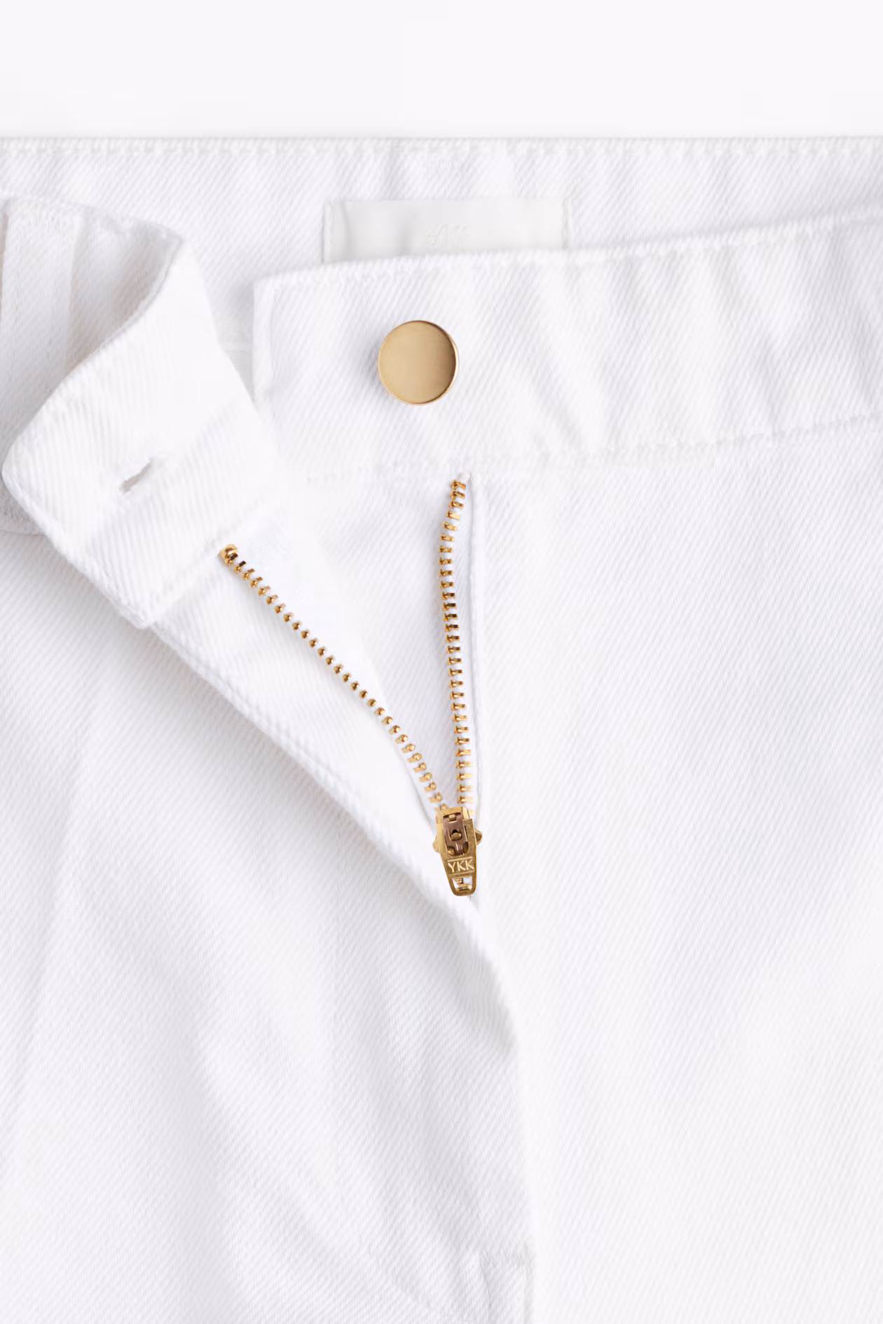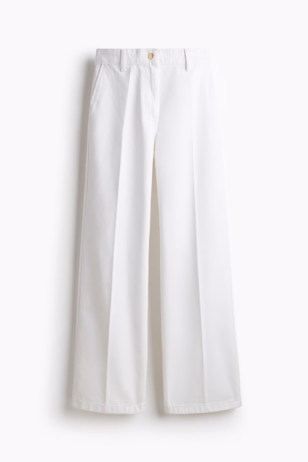 Jeans in rigid cotton denim that feels firm at first, softening and relaxing with wear. Regular fit from waist to hip and wide cut from thigh to hem. High waist, zip fly with button, and creases at front. Diagonal side pockets and mock welt back pockets. Wide, longer legs, designed to fall over foot with a stacking effect. A denim statement that goes the distance.
