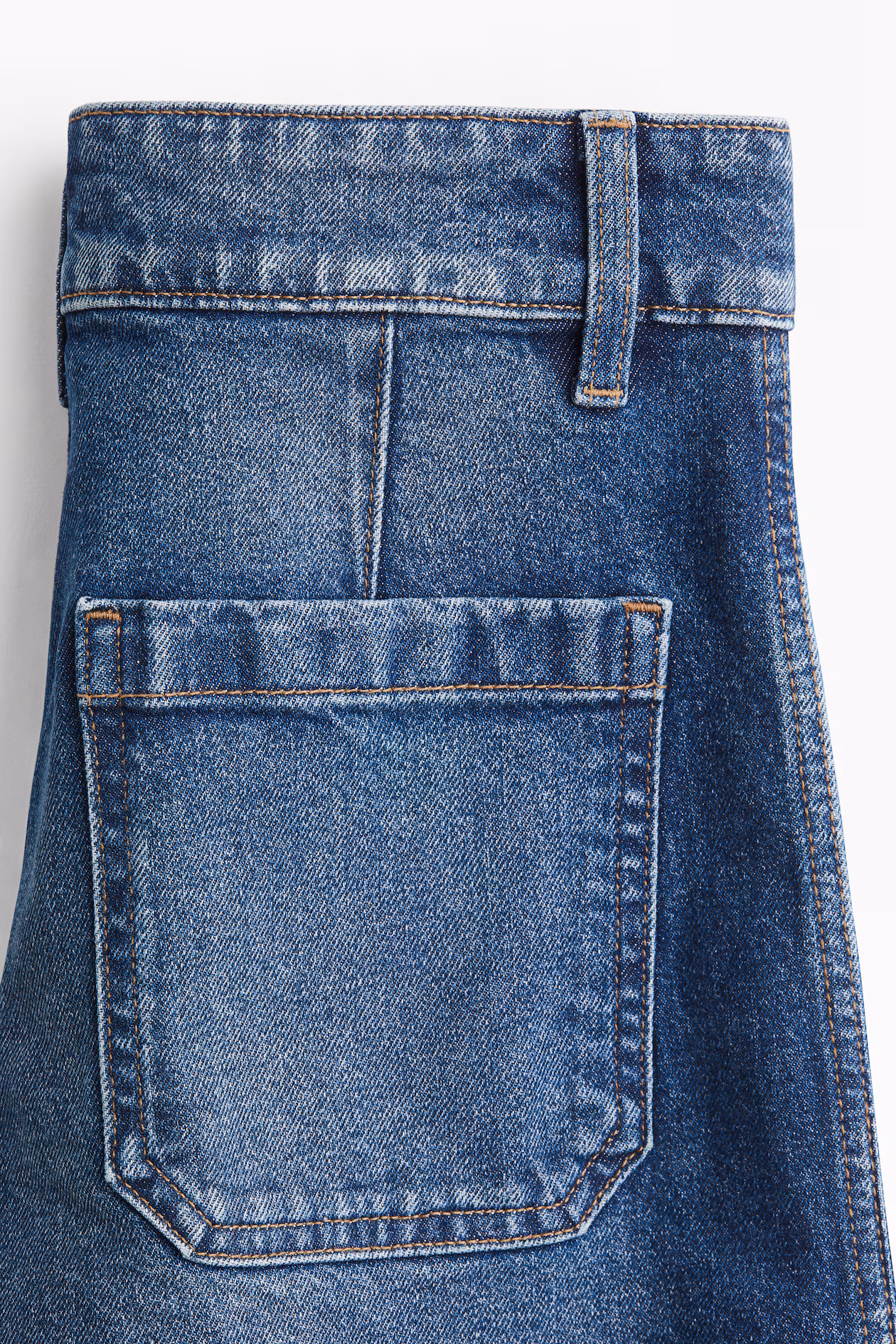Wide-leg jeans in cotton denim with gentle stretch for good comfort. Regular fit from waist to hip and wide cut from thigh to hem. High waist, zip fly with two buttons, patch back pockets, and creases at front and back. Longer length, designed to fall over foot with a stacking effect. Featuring a wide silhouette that's always flattering.