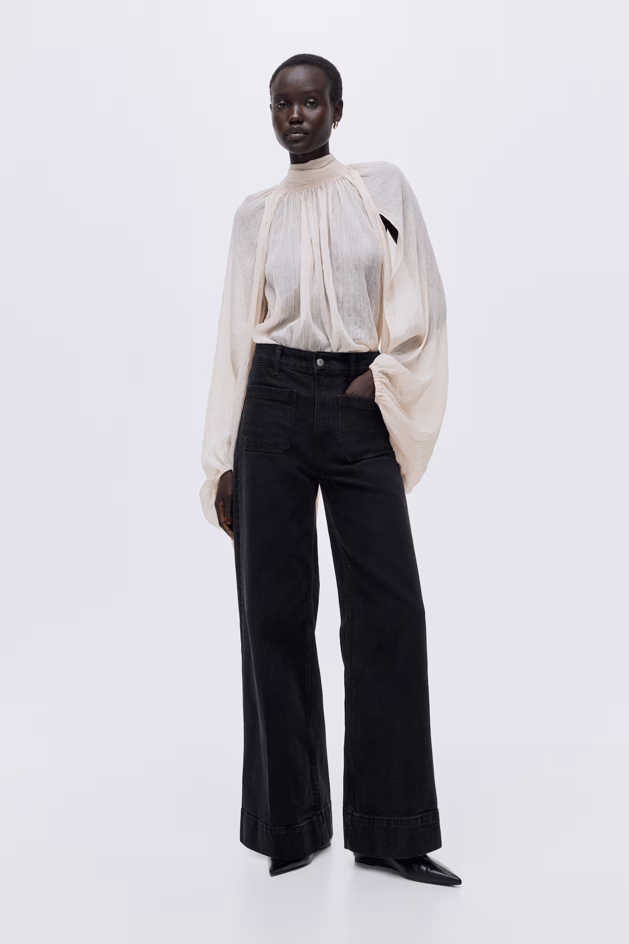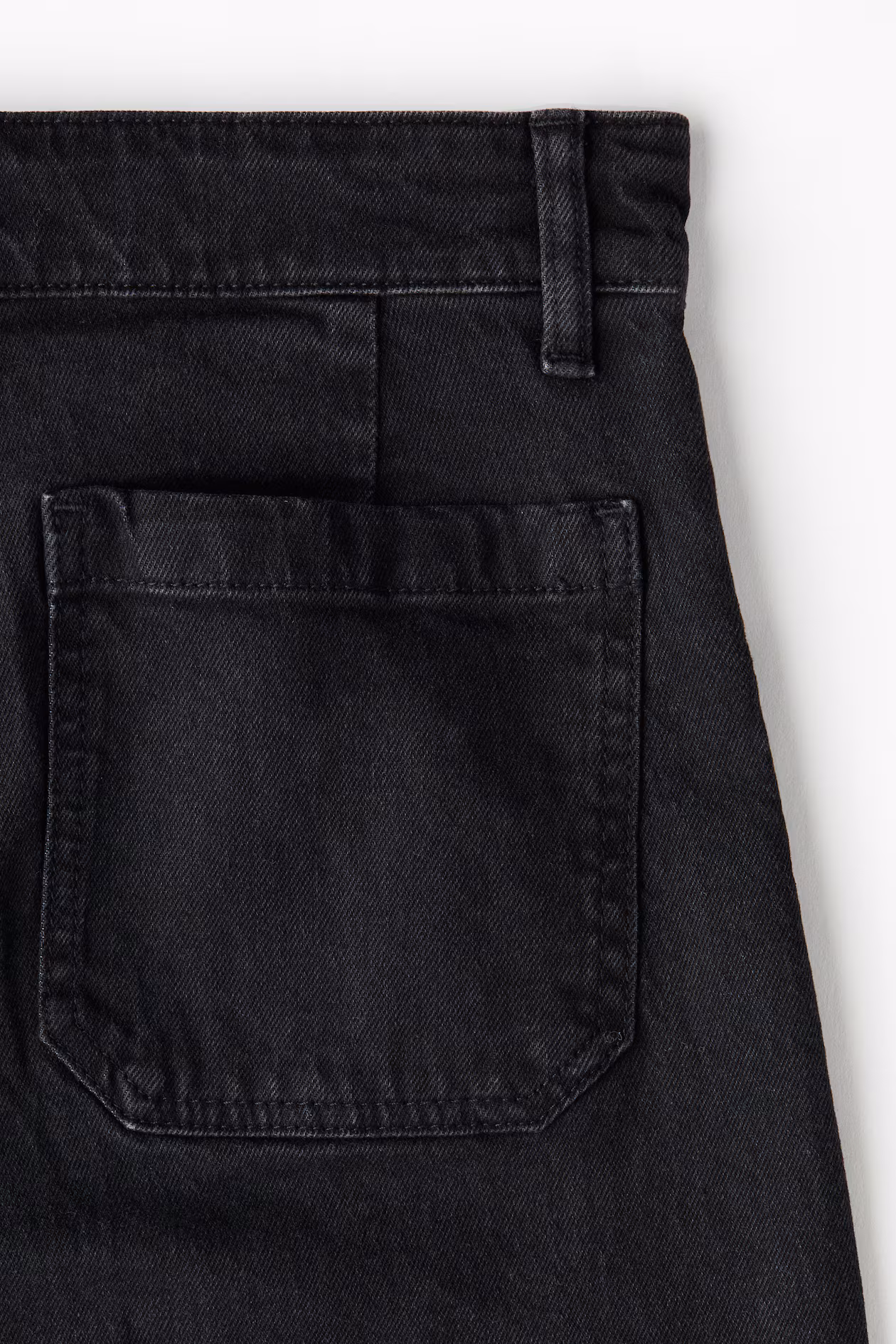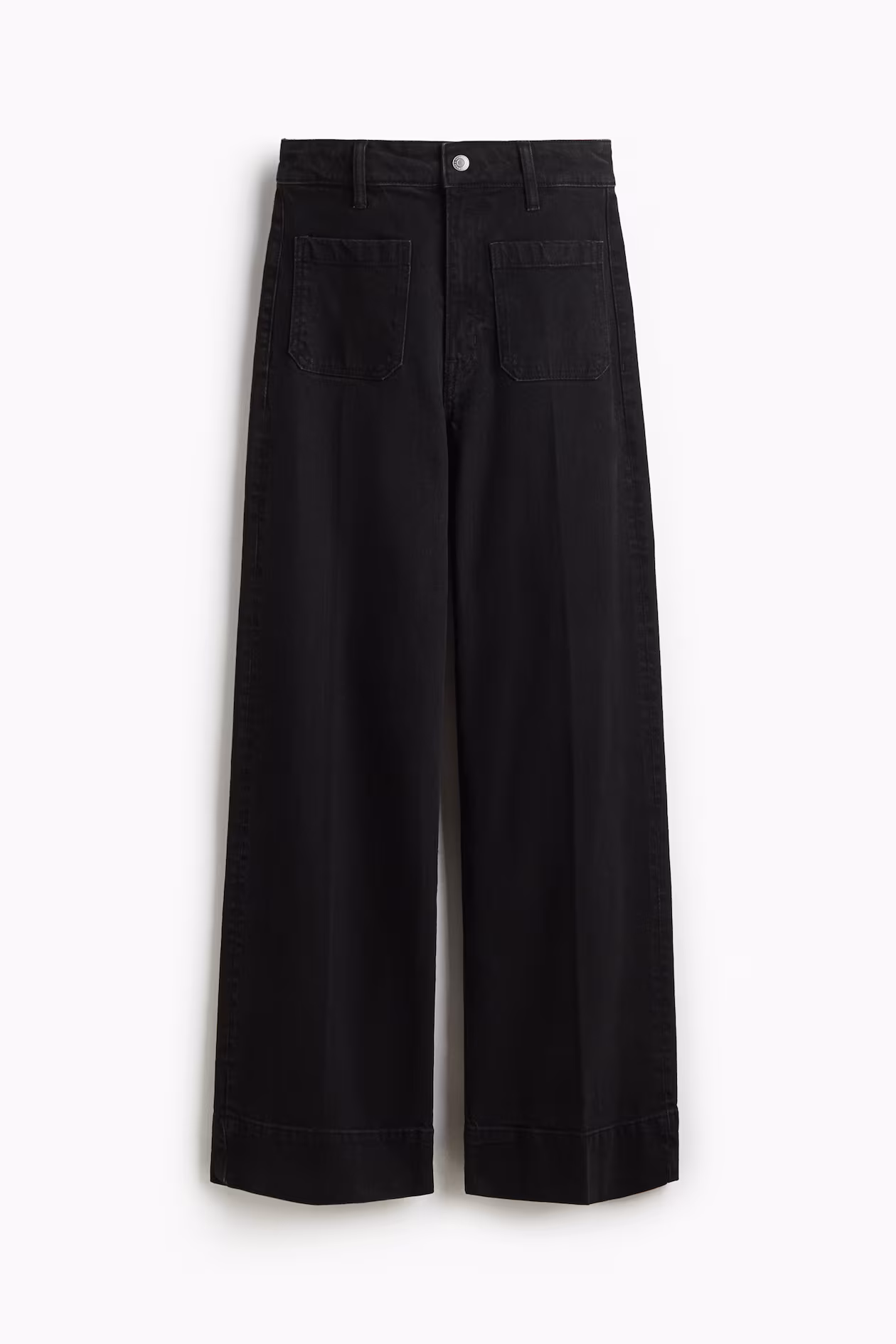 Jeans in cotton denim with a slight stretch for good comfort. Wide leg with a slim fit from the waist to the hip and a wide cut from the thigh to the hem. High waist with a zip fly and button. Patch front and back pockets. Regular length, designed to hit the top of the foot with little or no stacking. A denim statement that goes the distance.