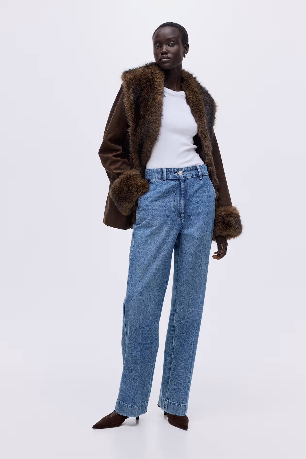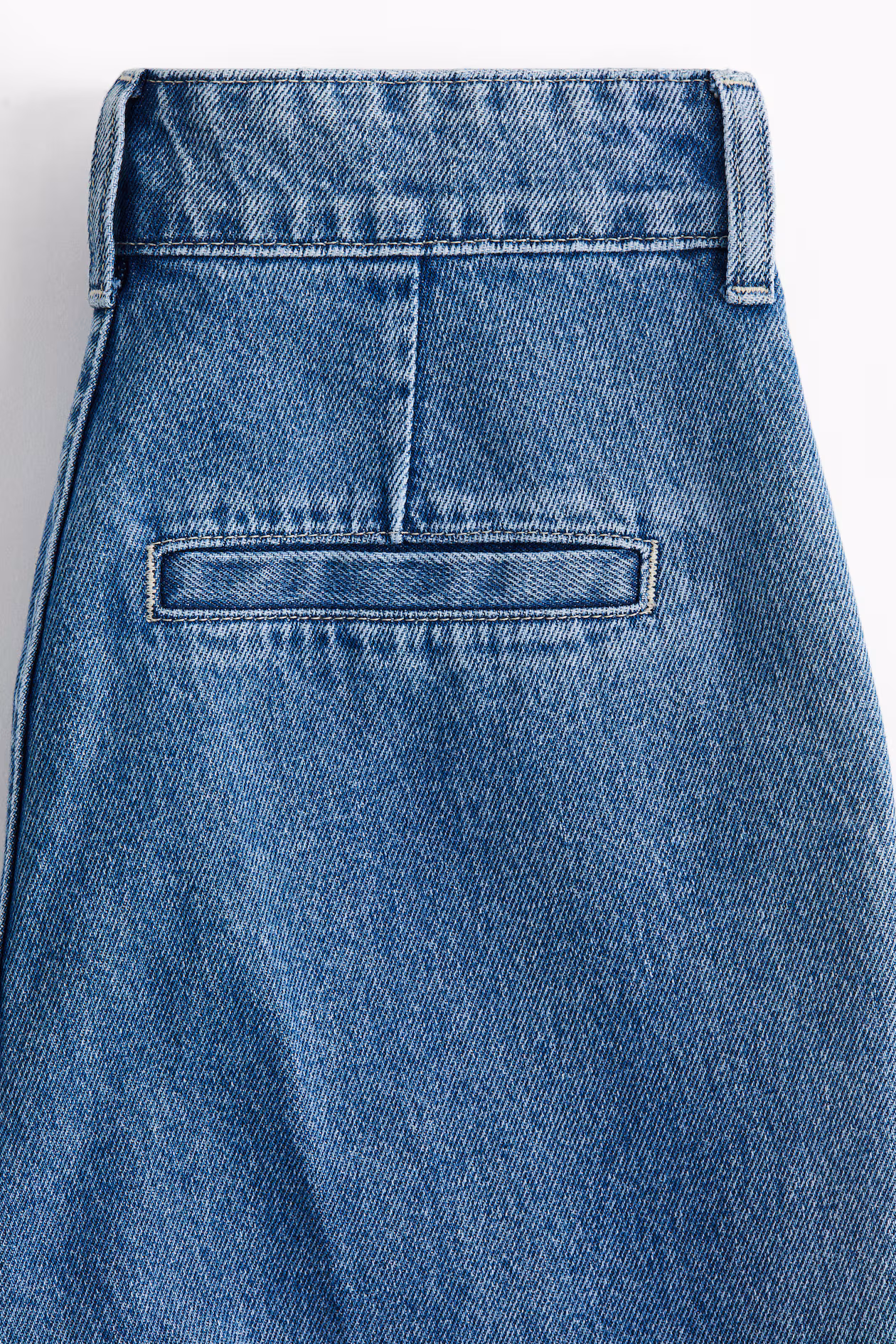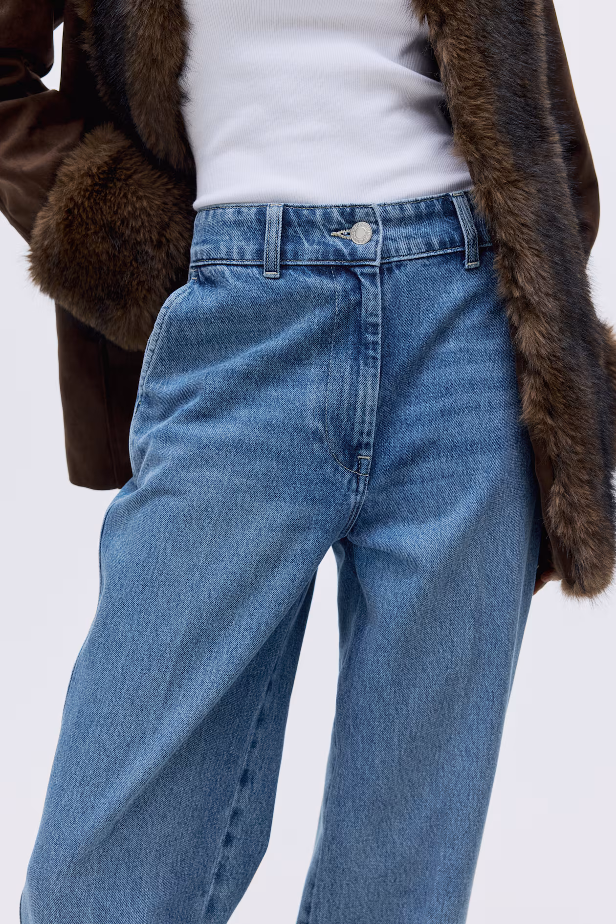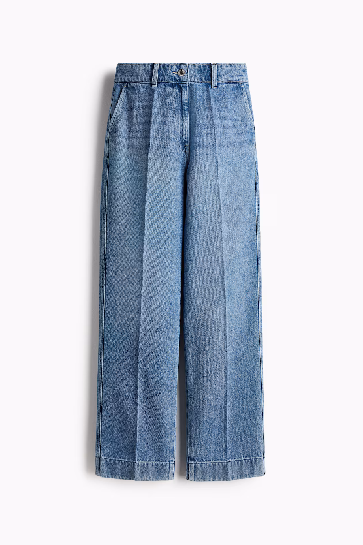 Jeans in rigid cotton denim that feels firm at first, softening and relaxing with wear. Regular fit from waist to hip and wide cut from thigh to hem. High waist, zip fly with button, and creases at front. Diagonal side pockets and mock welt back pockets. Wide, longer legs, designed to fall over foot with a stacking effect. A denim statement that goes the distance.