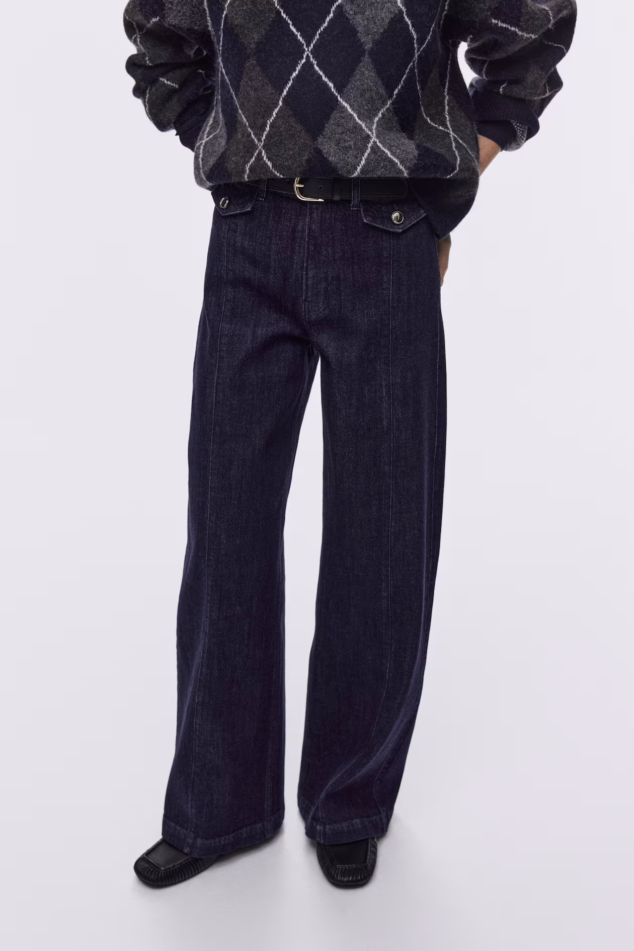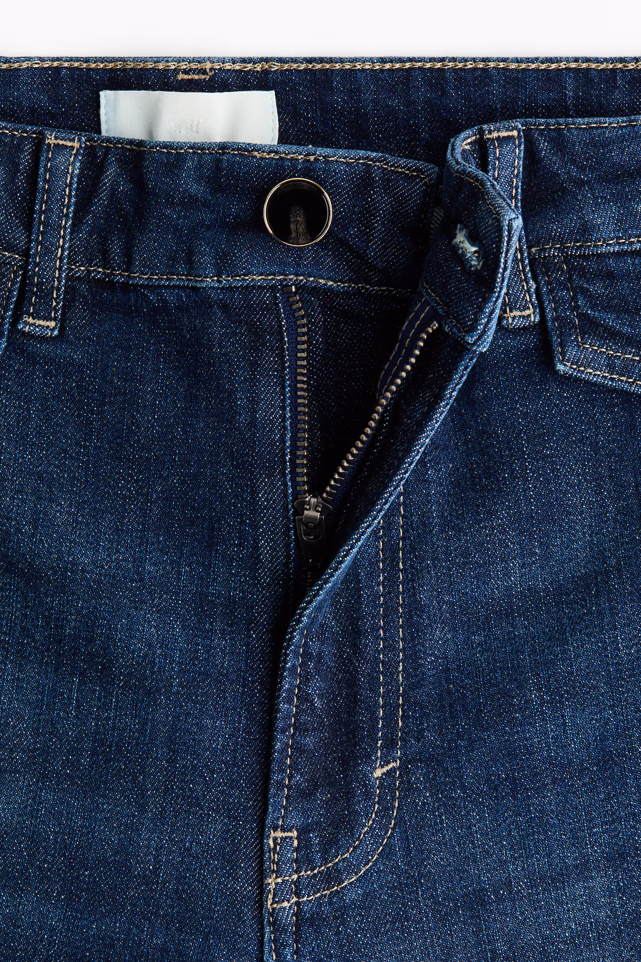 Jeans in cotton denim with gentle stretch for good comfort. Regular fit from waist to hip and wide cut from thigh to hem. High waist, zip fly with button, decorative front pocket flaps with button, and open back pockets. Visible, vertical seams at front. Wide, regular-length legs, designed to fall at top of foot with little or no stacking. Effortlessly flattering no matter how they're styled.