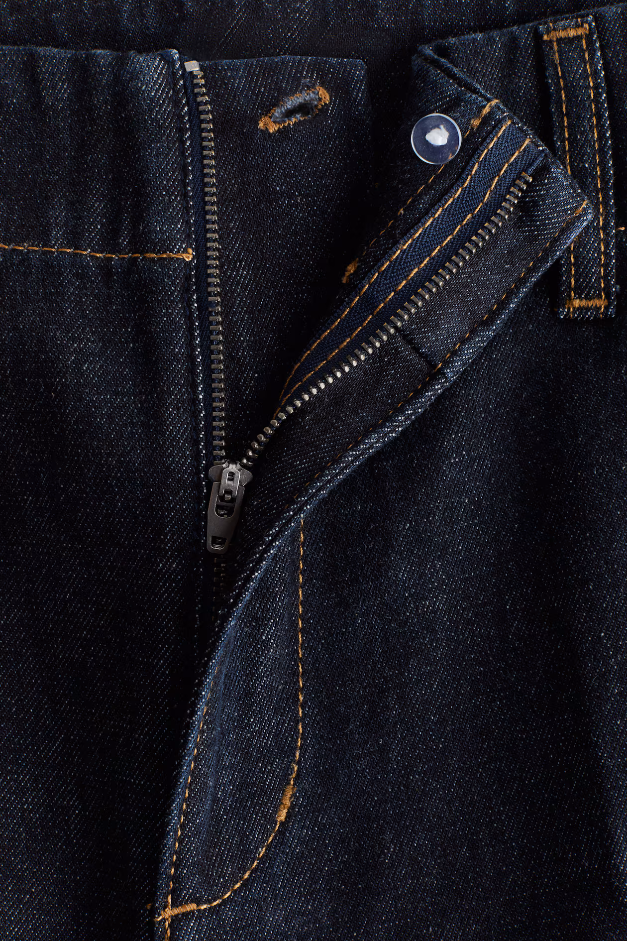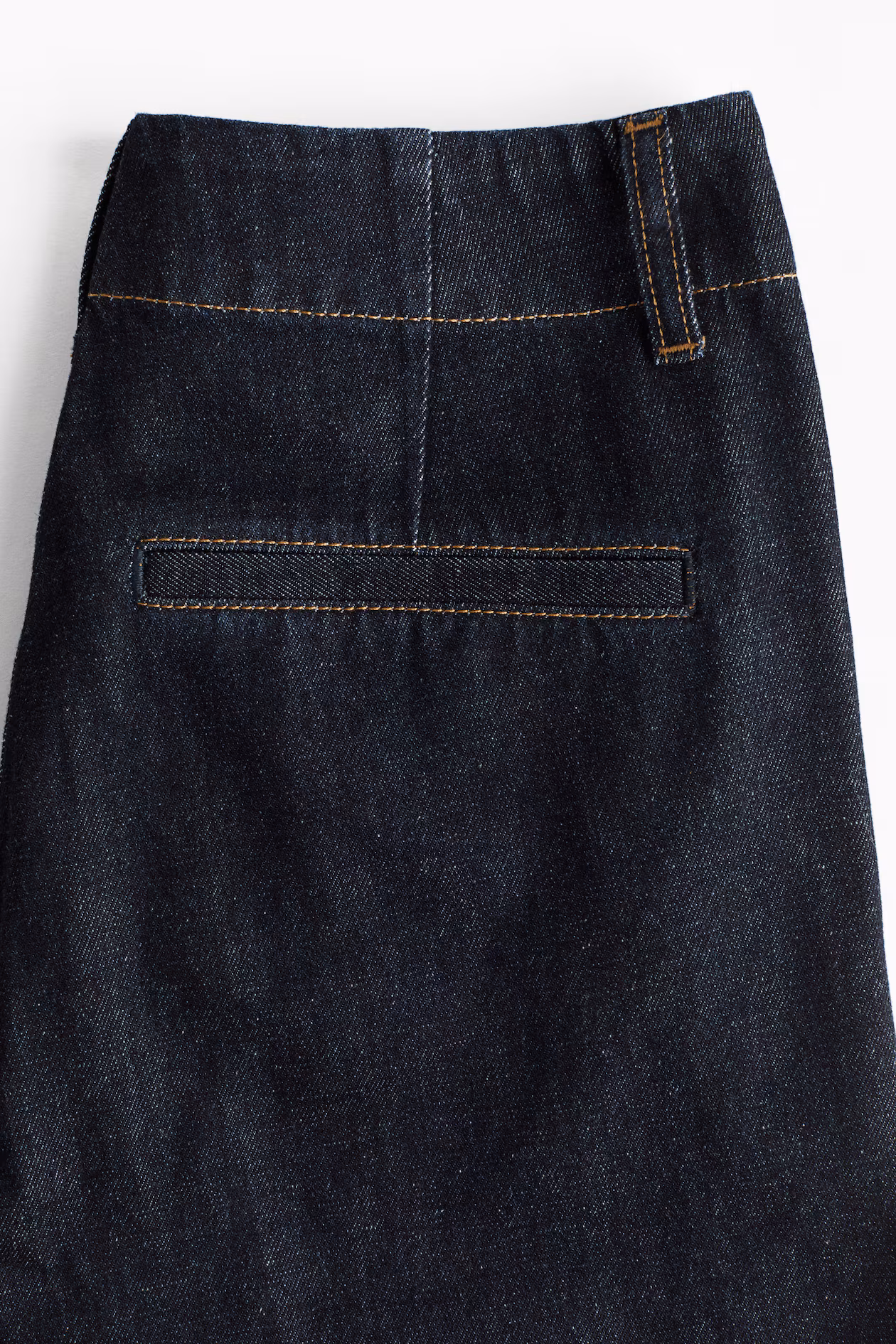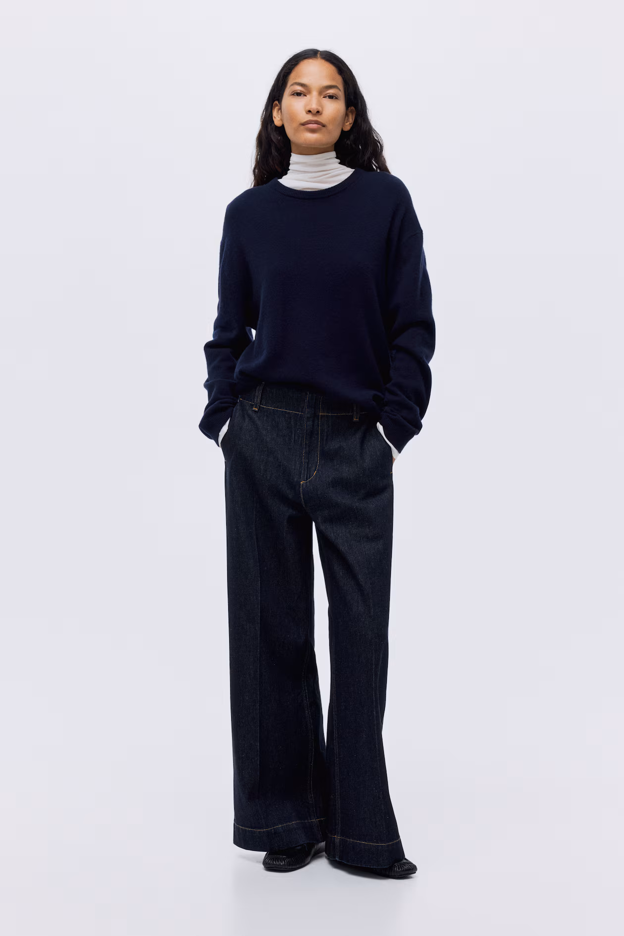Jeans in rigid cotton denim that feels firm at first, softening and relaxing with wear. Regular fit from waist to hip and wide cut from thigh to hem. High waist, zip fly with concealed button, and creases at front. Diagonal side pockets and mock welt back pockets. Wide, longer legs, designed to fall over foot with a stacking effect. A denim statement that goes the distance.