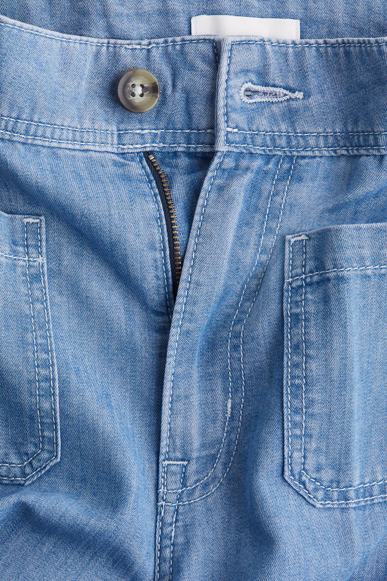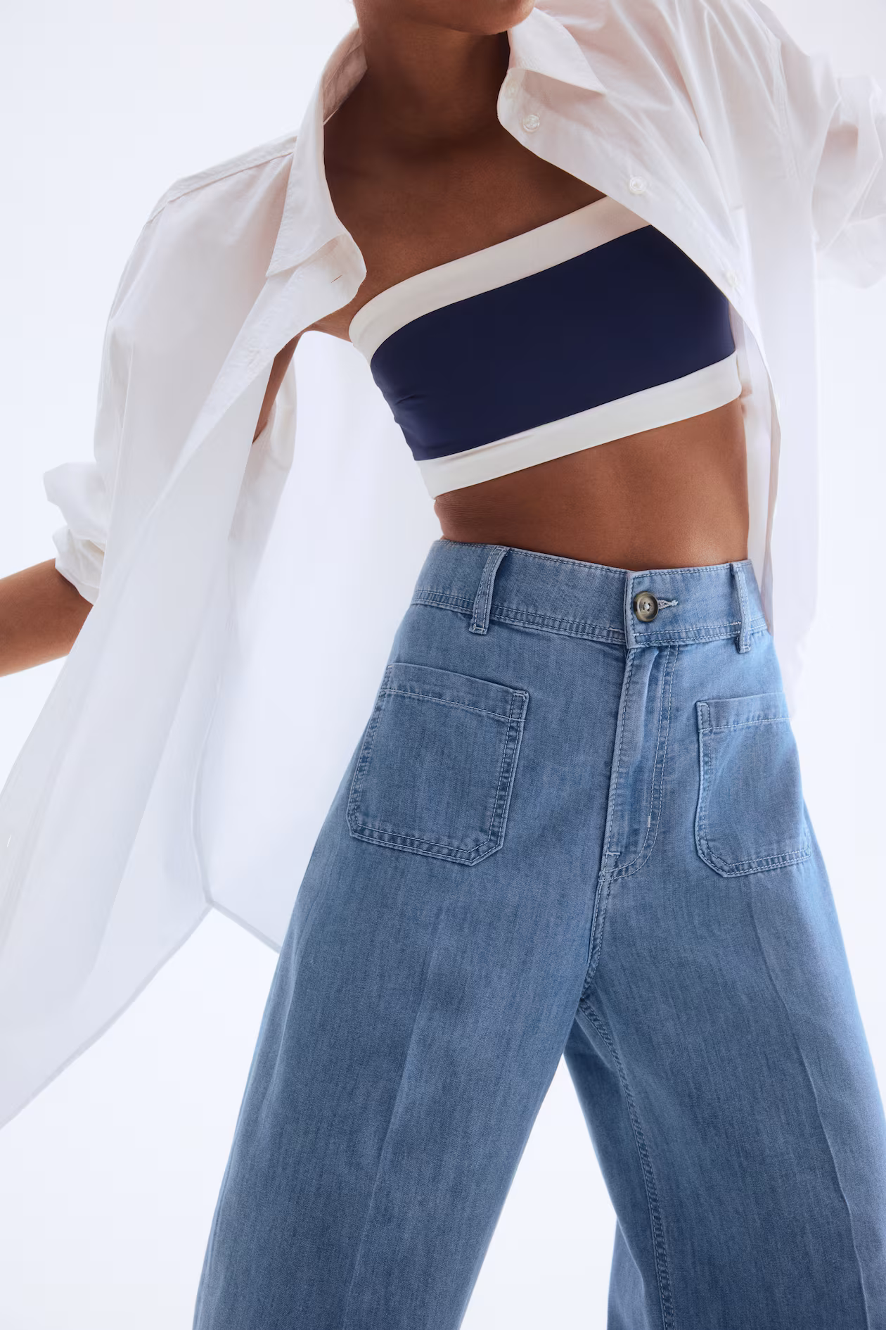 Jeans in rigid denim that feels firm at first, softening and relaxing with wear. Regular fit from waist to hip and wide cut from thigh to hem. High waist, zip fly with button, patch front pockets, and patch back pockets. Creases at front and back. Wide, longer-length legs, designed to fall over foot with a stacking effect. Inspired by the 70s, designed for today.