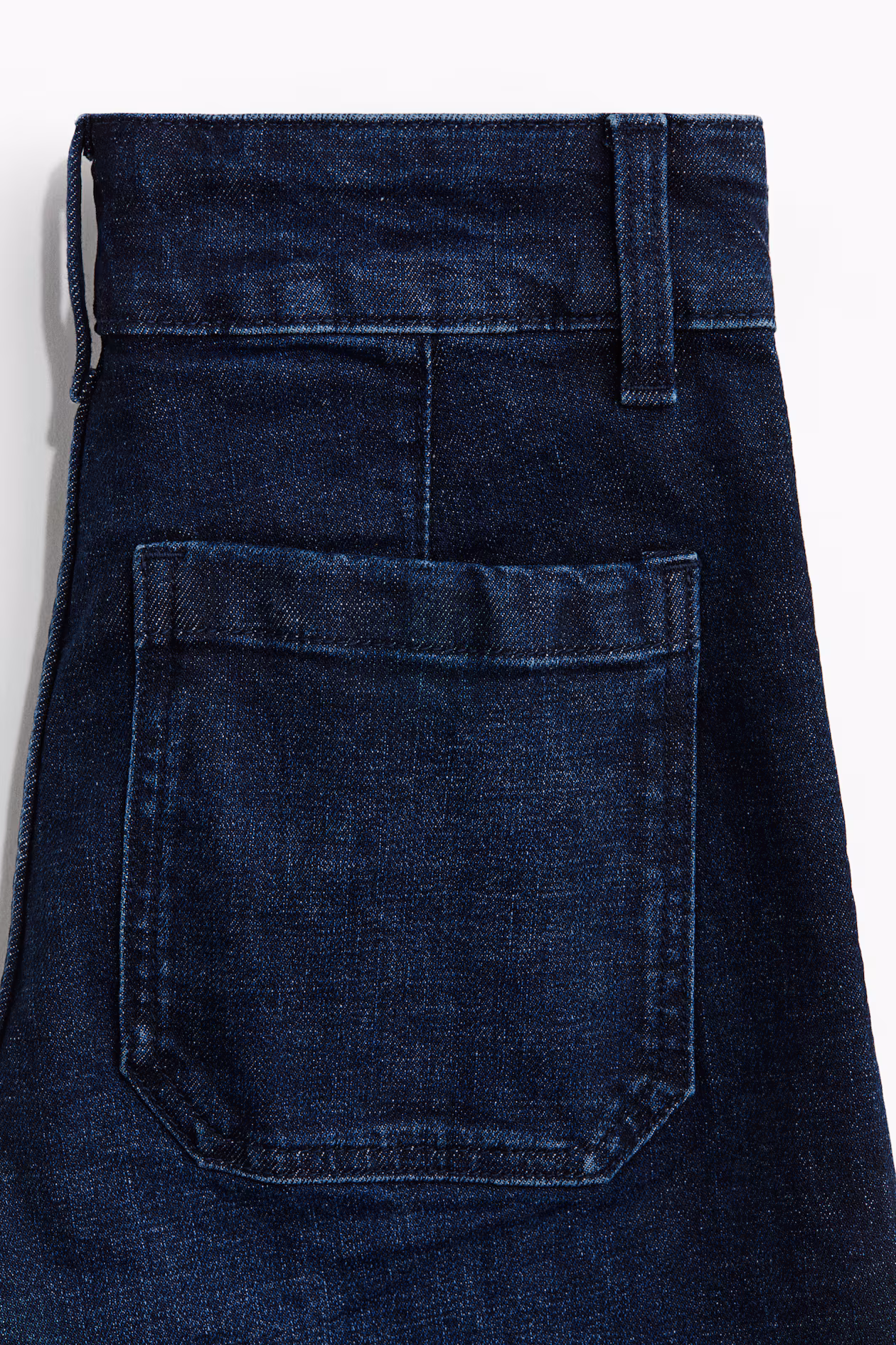 Wide-leg jeans in cotton denim with gentle stretch for good comfort. Regular fit from waist to hip and wide cut from thigh to hem. High waist, zip fly with two buttons, patch back pockets, and creases at front and back. Longer length, designed to fall over foot with a stacking effect. Featuring a wide silhouette that's always flattering.