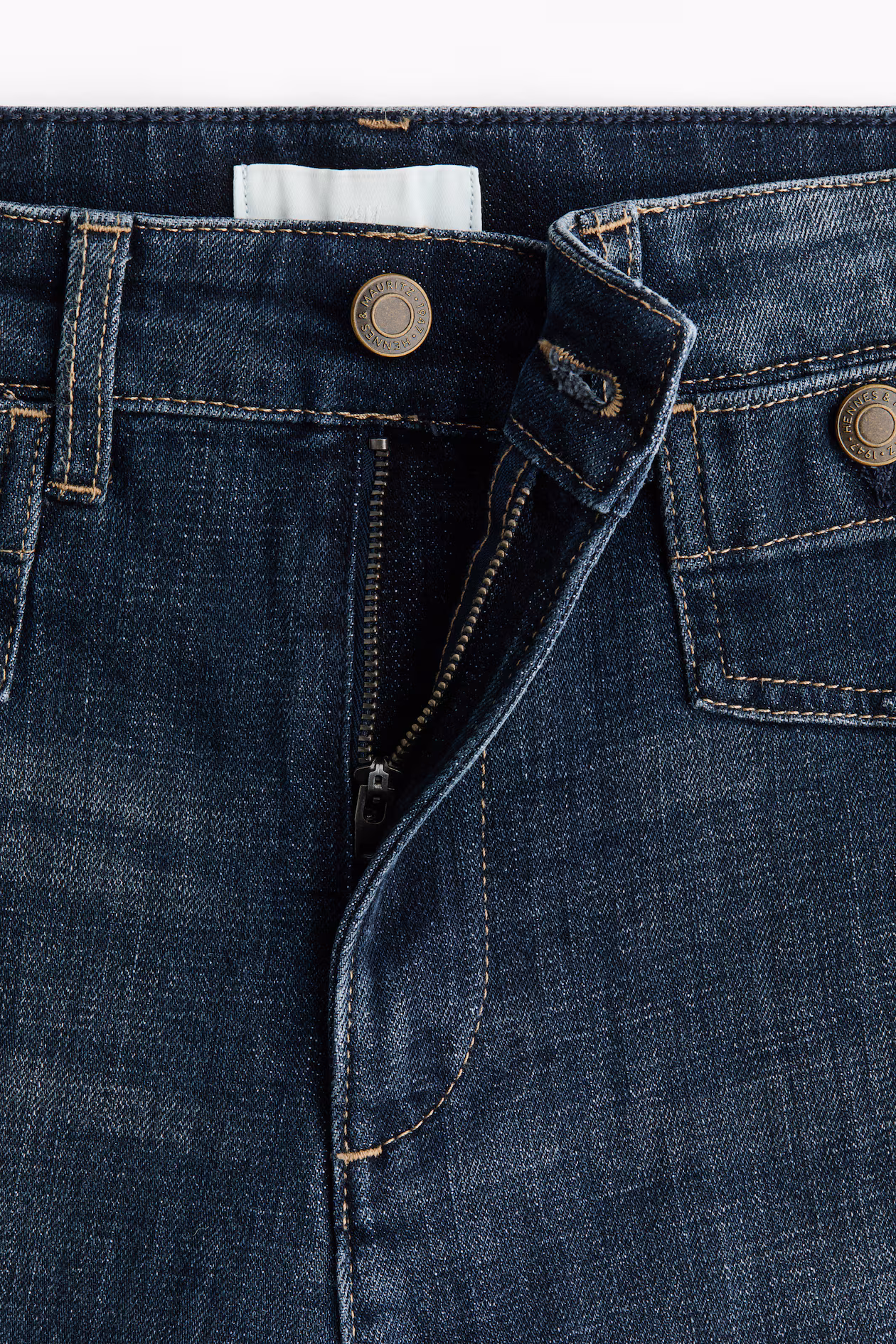 Ankle-length jeans in cotton denim with gentle stretch for good comfort. Slim fit from waist to hip and wide cut from thigh to hem. High waist, zip fly with button, and patch front pockets with button. Wide legs with creases at front and back.