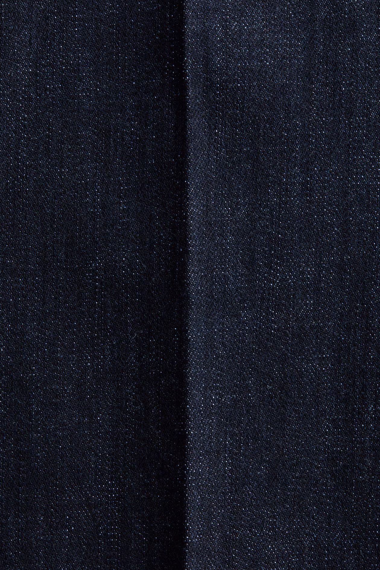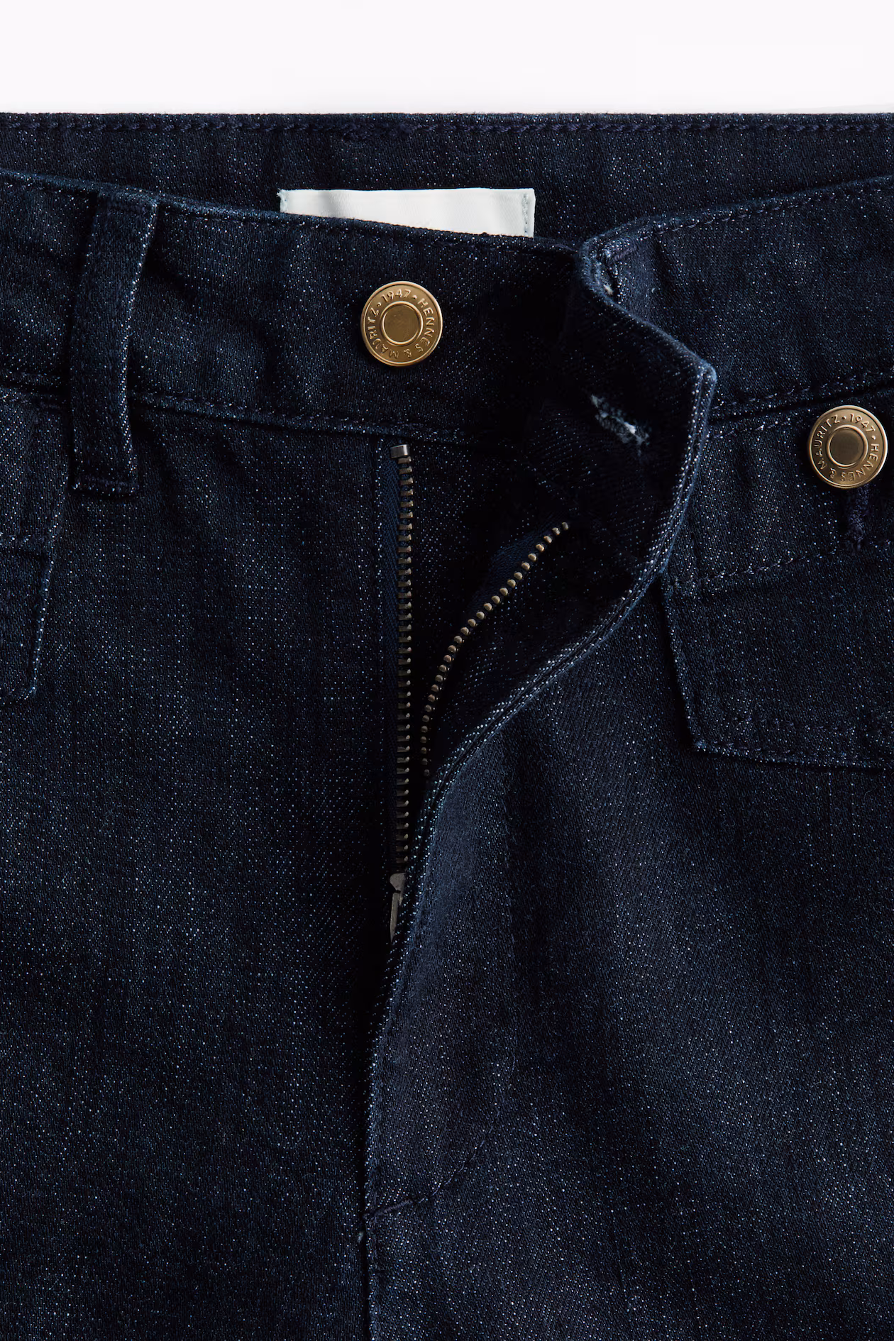 Ankle-length jeans in cotton denim with gentle stretch for good comfort. Slim fit from waist to hip and wide cut from thigh to hem. High waist, zip fly with button, and patch front pockets with button. Wide legs with creases at front and back.
