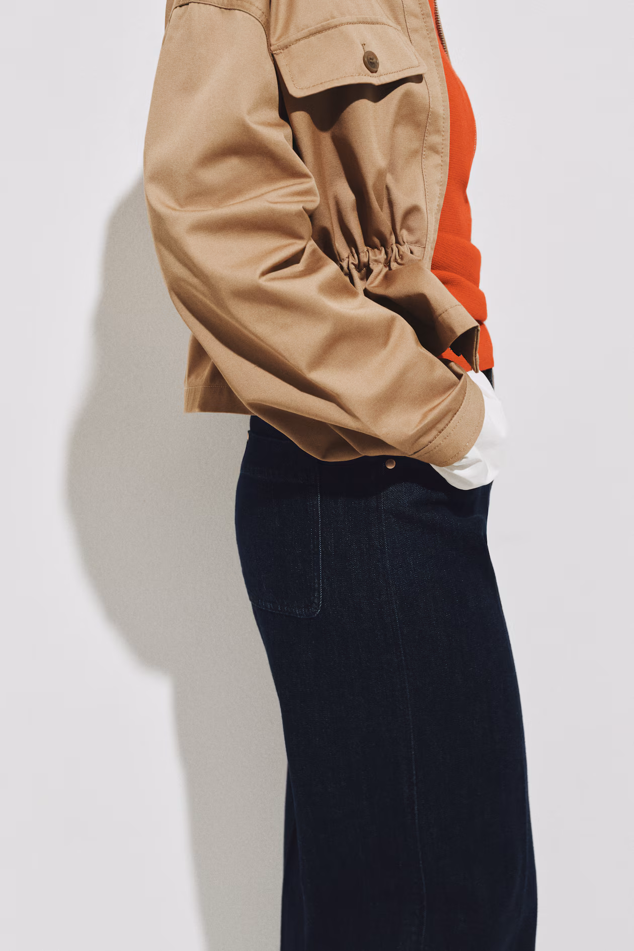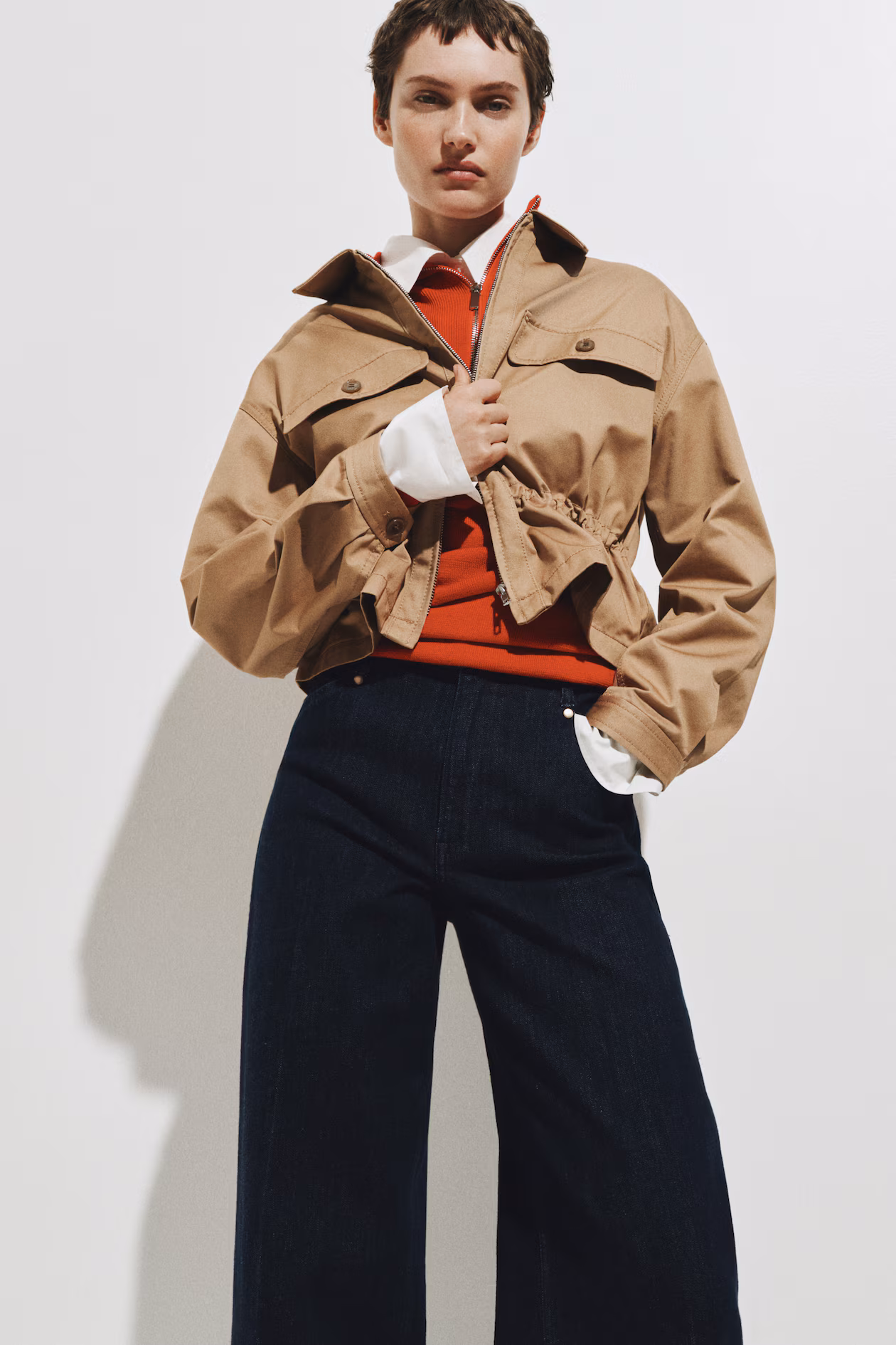 Jeans in cotton denim with gentle stretch for good comfort. Regular fit from waist to hip and wide cut from thigh to hem. High waist, zip fly with button, diagonal front pockets, and patch back pockets. Ceases at front and back. Wide, regular-length legs, designed to fall at top of foot with little or no stacking.