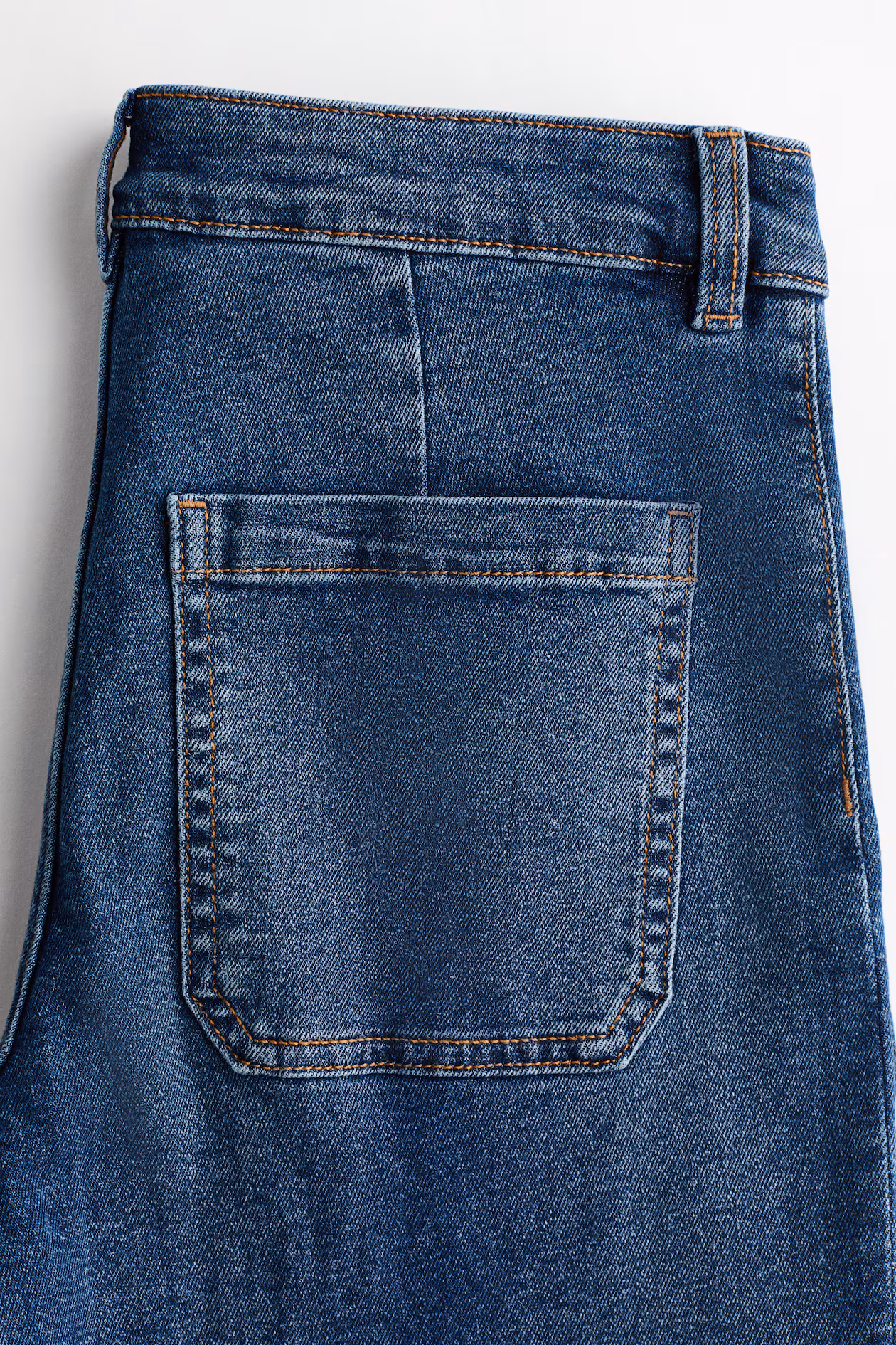 Jeans in cotton denim with gentle stretch for good comfort. Slim fit from waist to hip and wide cut from thigh to hem. High waist, zip fly with button, patch front pockets, and patch back pockets. Wide, regular-length legs, designed to fall at top of foot with little or no stacking. Inspired by the 70s, designed for today.