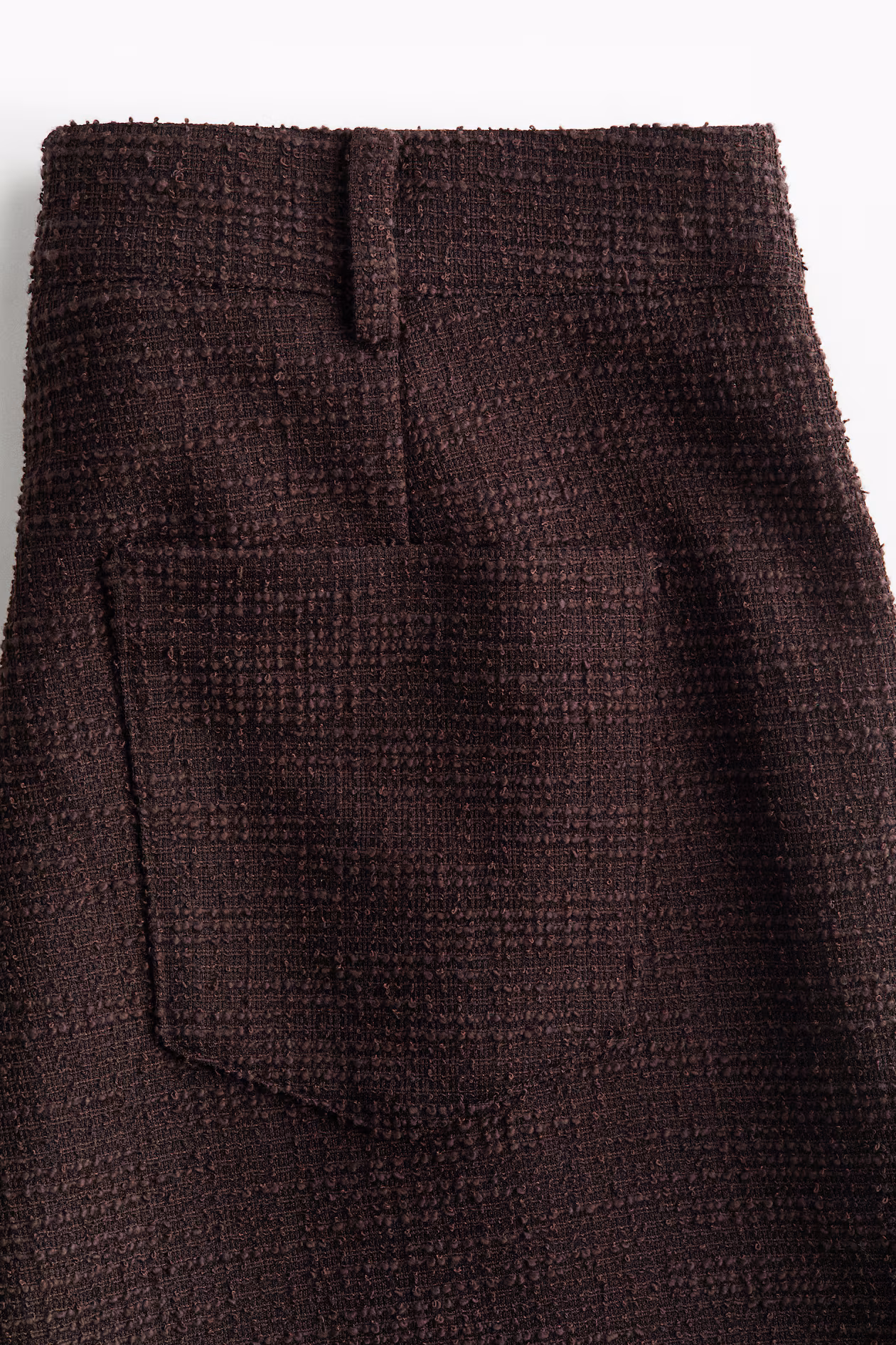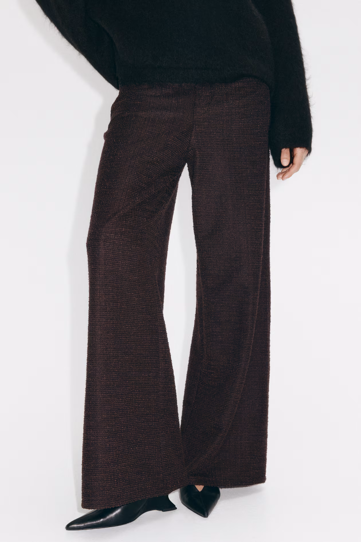 Wide-leg pants in bouclé jersey. Concealed, elasticized waistband, mock fly with button, front pockets, and patch back pockets.