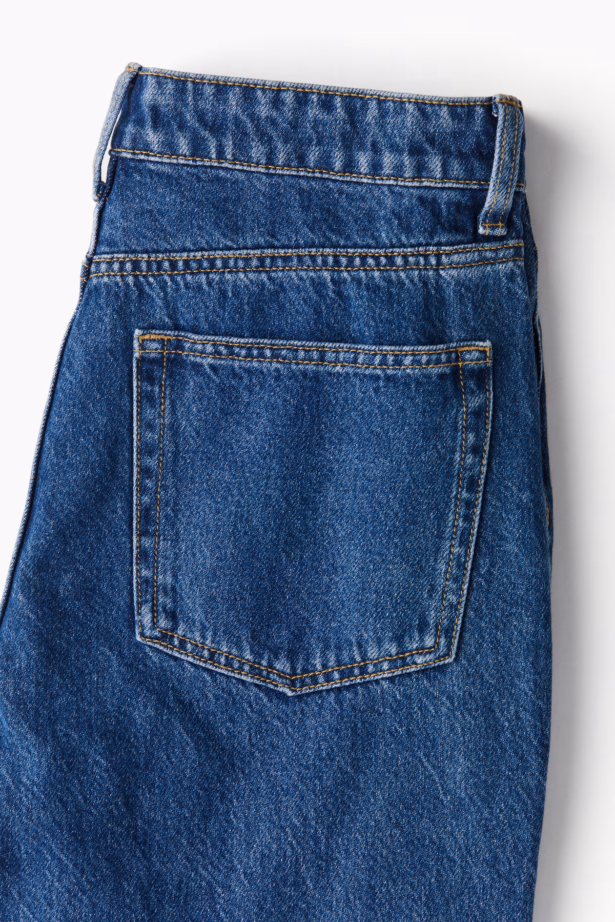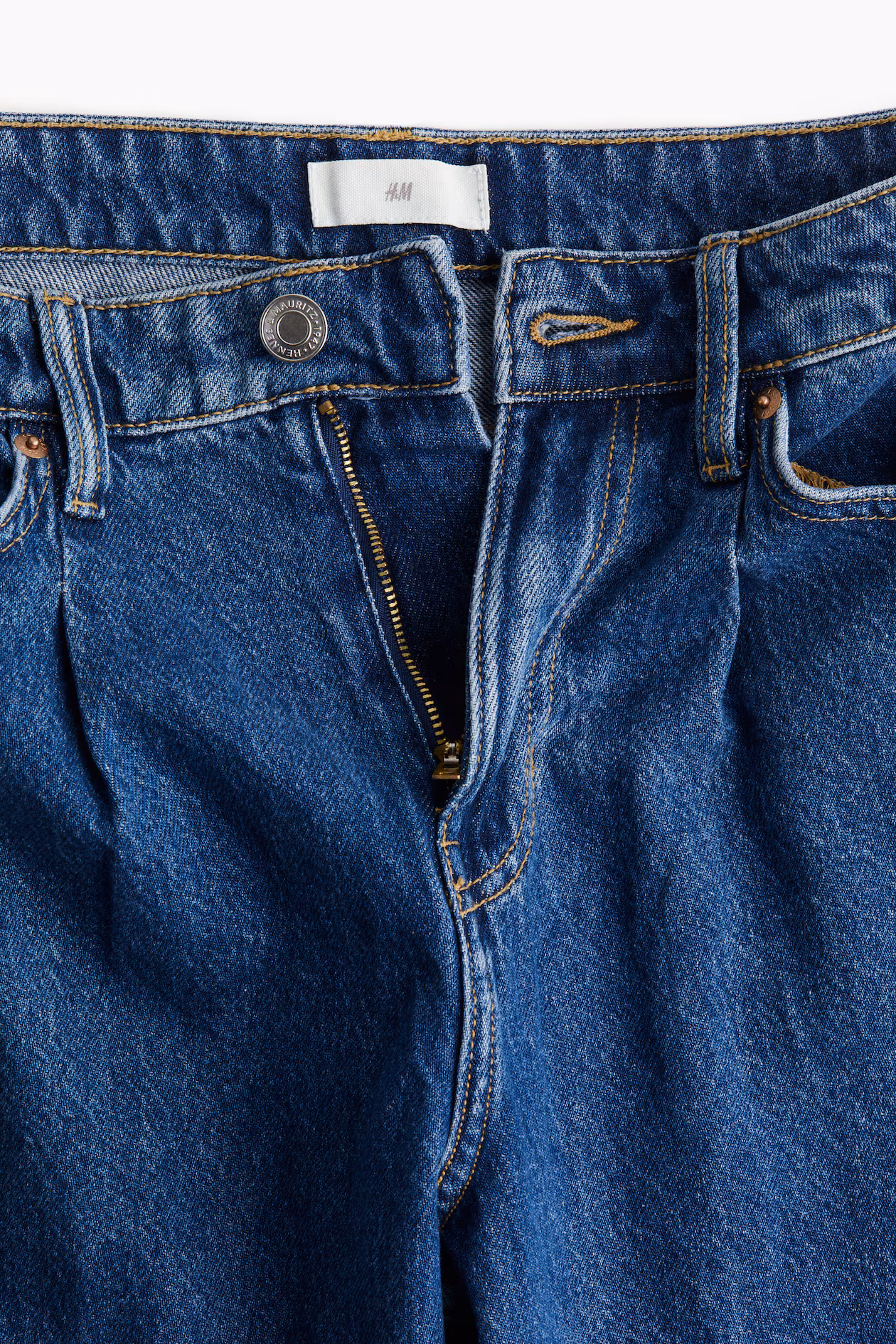 5-pocket pants in rigid cotton denim. High waist, zip fly with button, and pleats at top. Straight, wide legs.