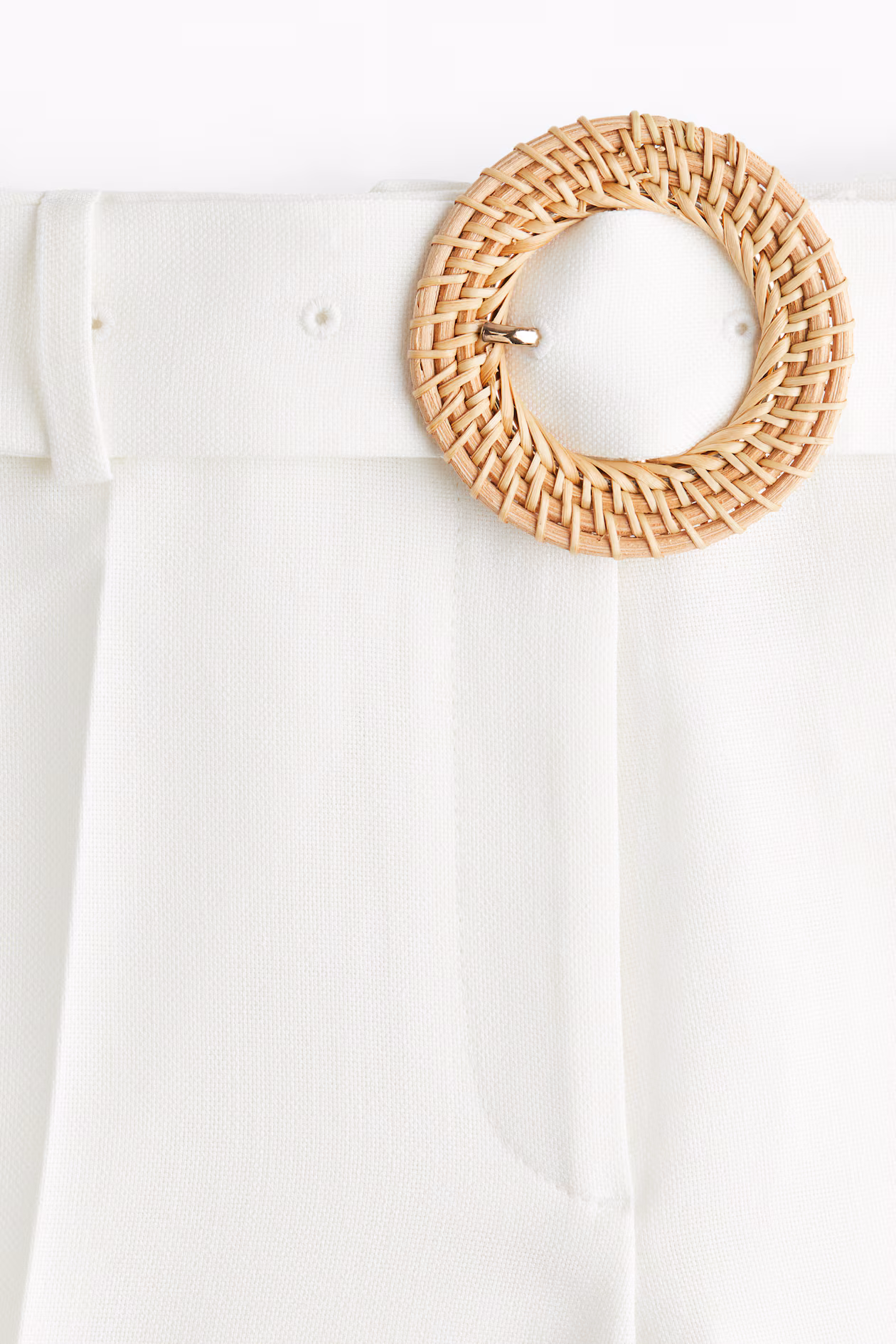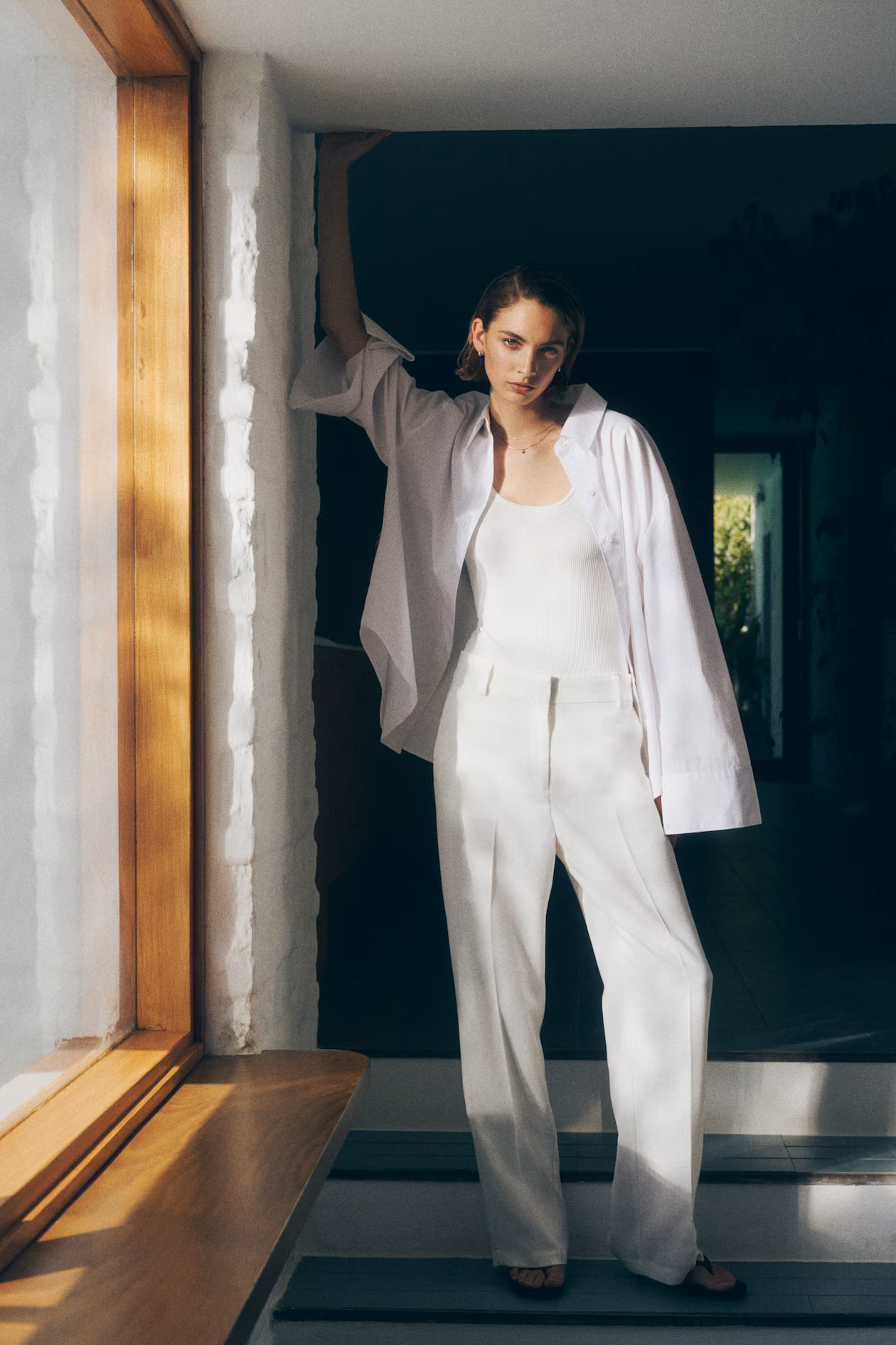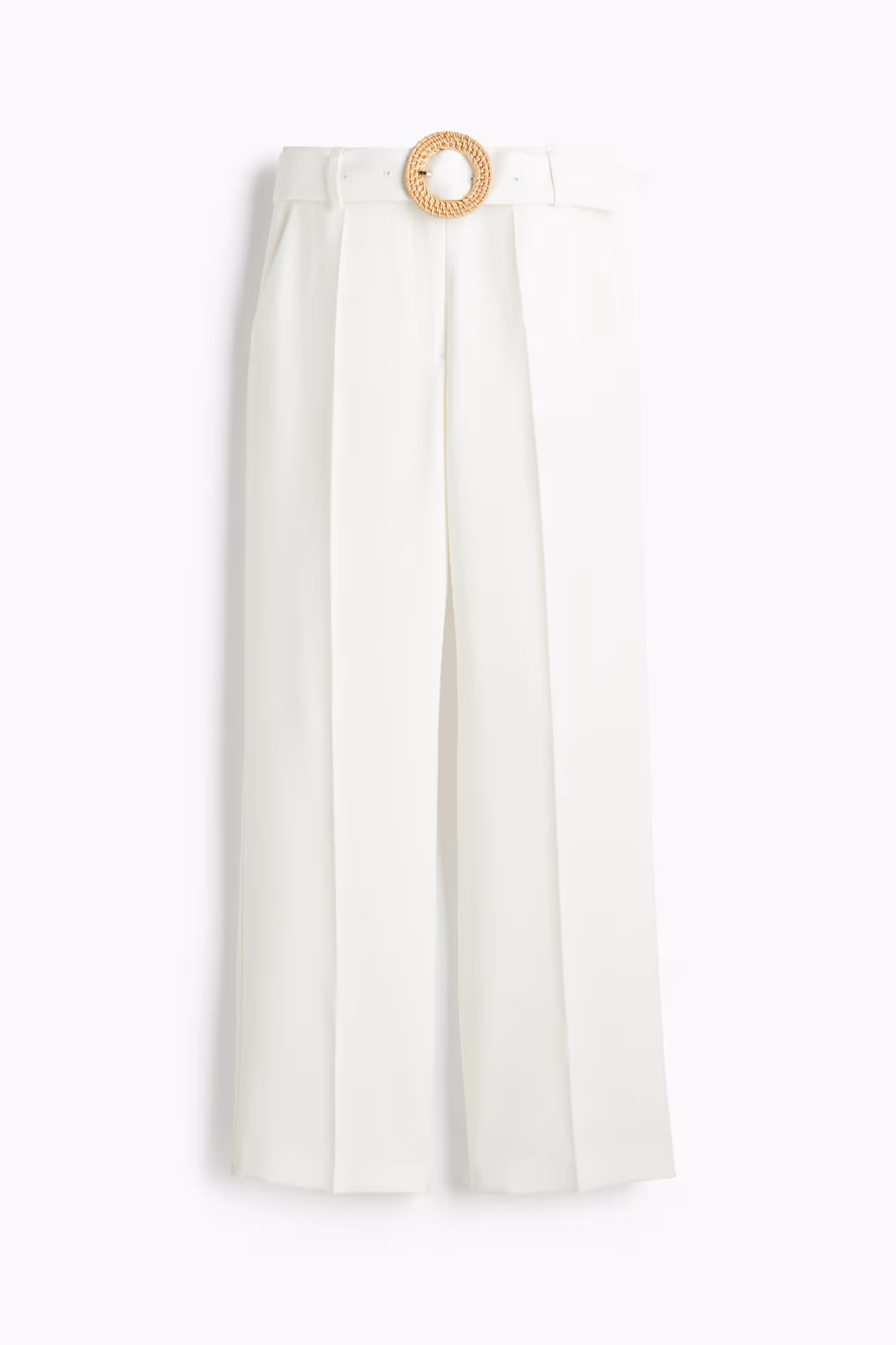 Pants in woven fabric. High waist, zip fly with concealed button and hook-and-bar fastener, diagonal side pockets, and mock welt back pockets. Wide legs with creases at front and back.