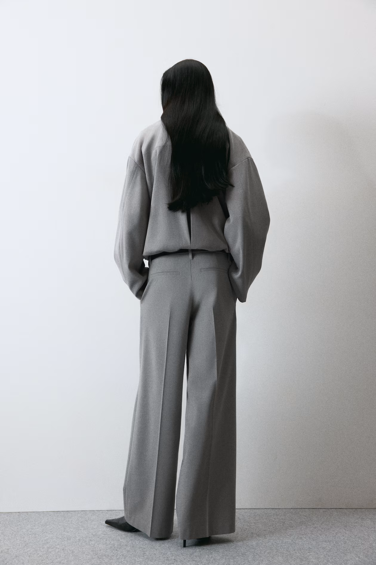 Loose-fit pants in woven fabric with pleats at front. Zip fly with concealed button and hook-and-bar fastener. Diagonal side pockets, mock welt back pockets, and wide legs with creases at front and back.
