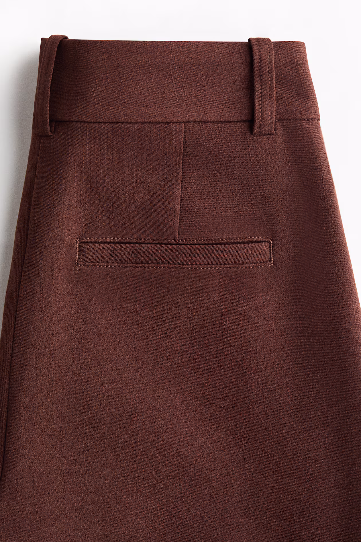 Dress pants in woven fabric with creases at front and back. High waist, concealed hook-and-bar fastening, and zip fly. Discreet side pockets, a mock welt back pocket, and wide legs.