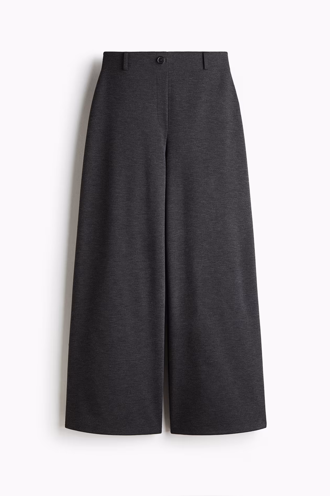 Wide-leg pants in thick jersey. Regular waist, covered elastic at waistband, and mock fly with button.