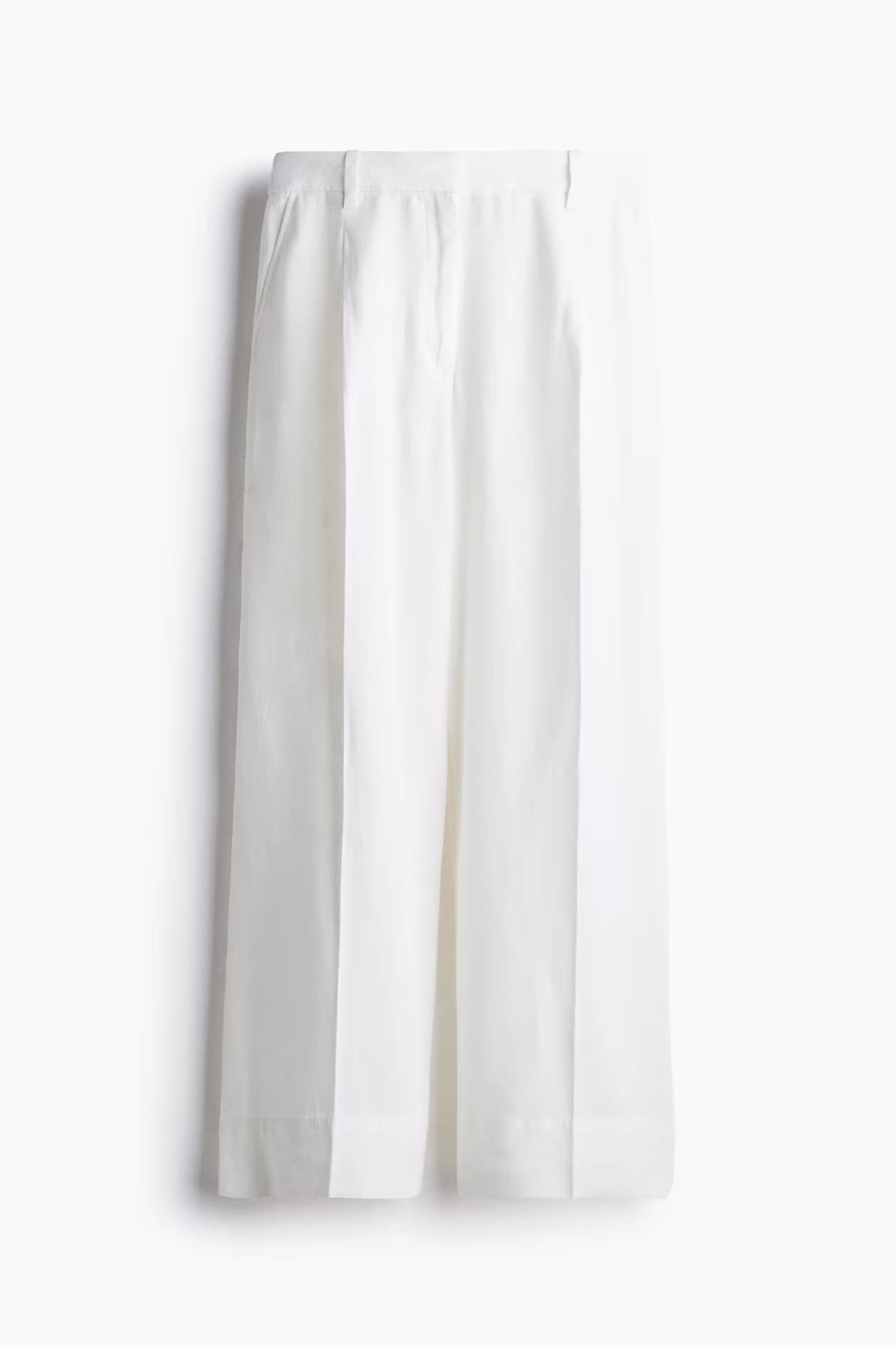 Loose-fit, ankle-length dress pants in a woven linen and viscose blend. High waist, zip fly with concealed hook-and-bar fasteners, diagonal side pockets, and a mock welt back pocket. Wide legs with pleats at front and creases at front and back.