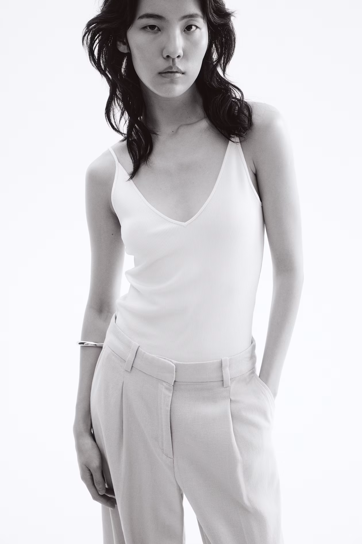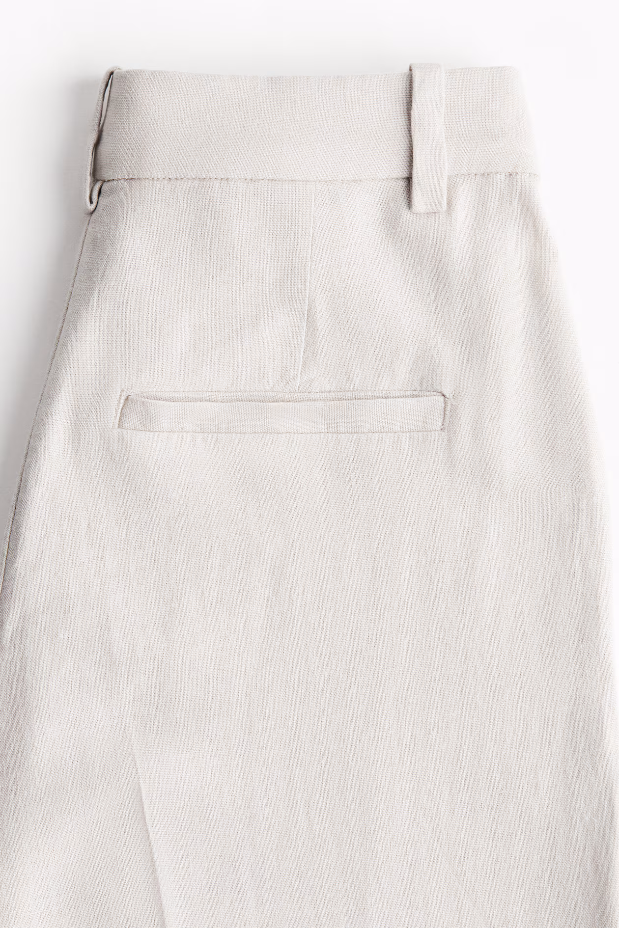 Loose-fit, ankle-length dress pants in a woven linen and viscose blend. High waist, zip fly with concealed hook-and-bar fasteners, diagonal side pockets, and a mock welt back pocket. Wide legs with pleats at front and creases at front and back.