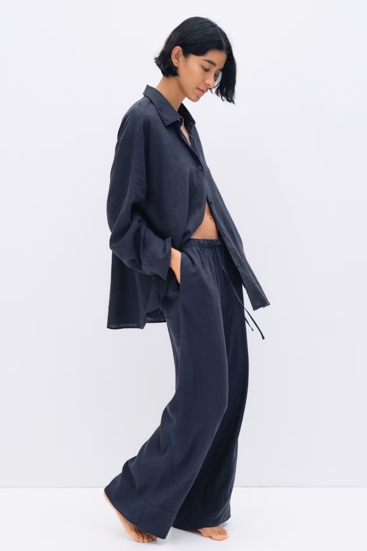 Relaxed-fit pants in a woven linen and viscose blend. Elasticized waistband with drawstring, discreet side pockets, and wide legs.