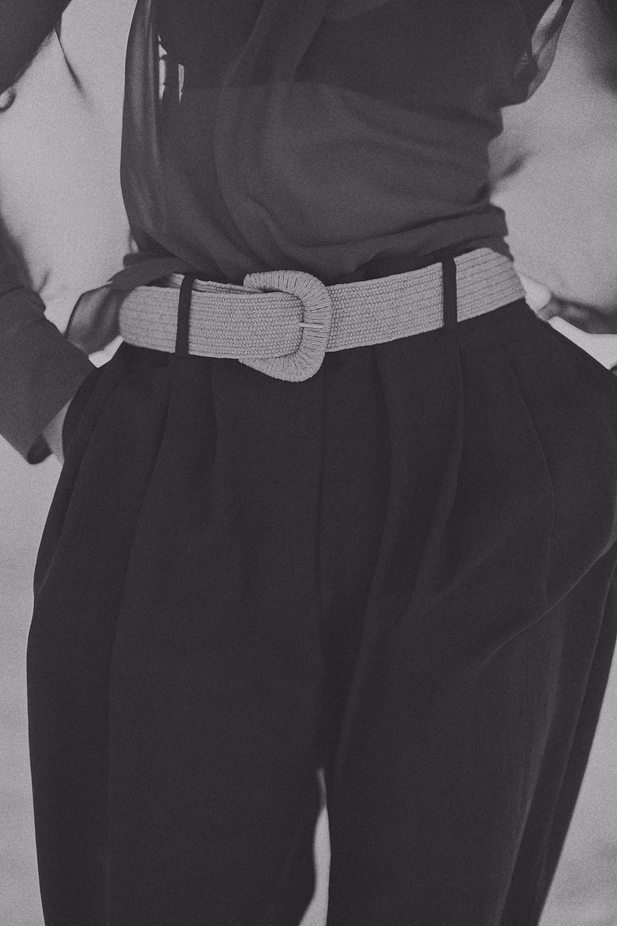 Loose-fit dressy pants in twill with pleats at front. High waist, wide belt in raffia, and a zip fly with concealed hook-and-bar fasteners. Discreet side pockets, mock welt back pockets, and wide legs with creases at front and back.