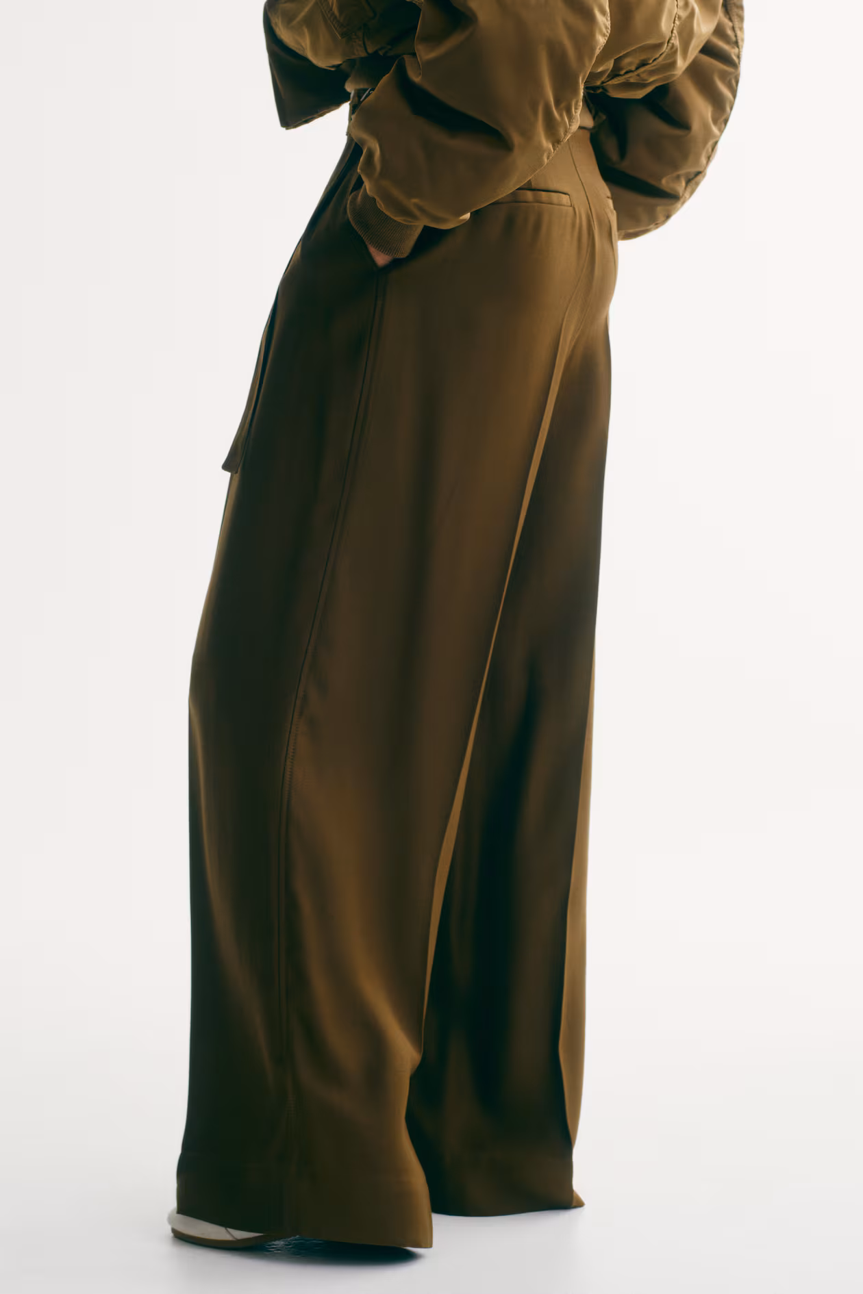 Loose-fit pants in woven fabric with pleats at front. High waist and zip fly with concealed hook-and-bar fasteners. Belt threaded through casing at back of waistband, and a metal buckle fastener at sides. Diagonal side pockets, mock welt back pockets, and wide legs with creases at front and back.
