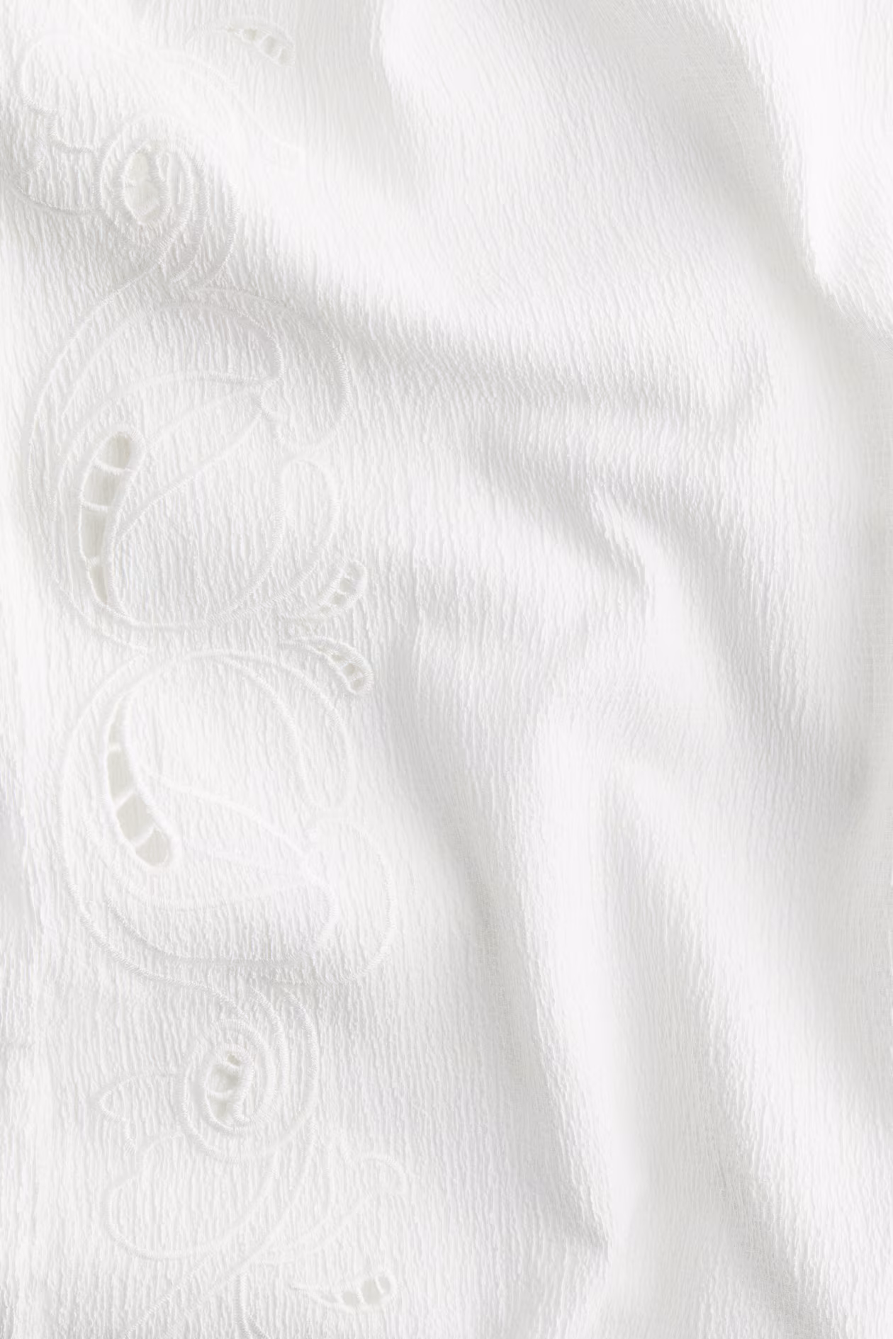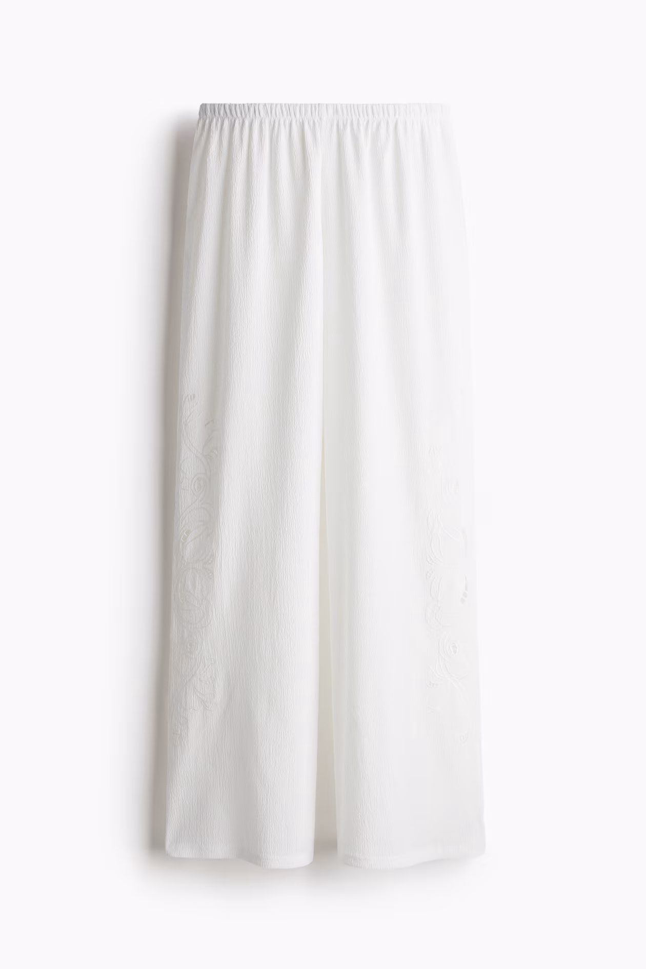 Pants in crêpe jersey with eyelet embroidery. Covered elastic at waistband and wide legs.
